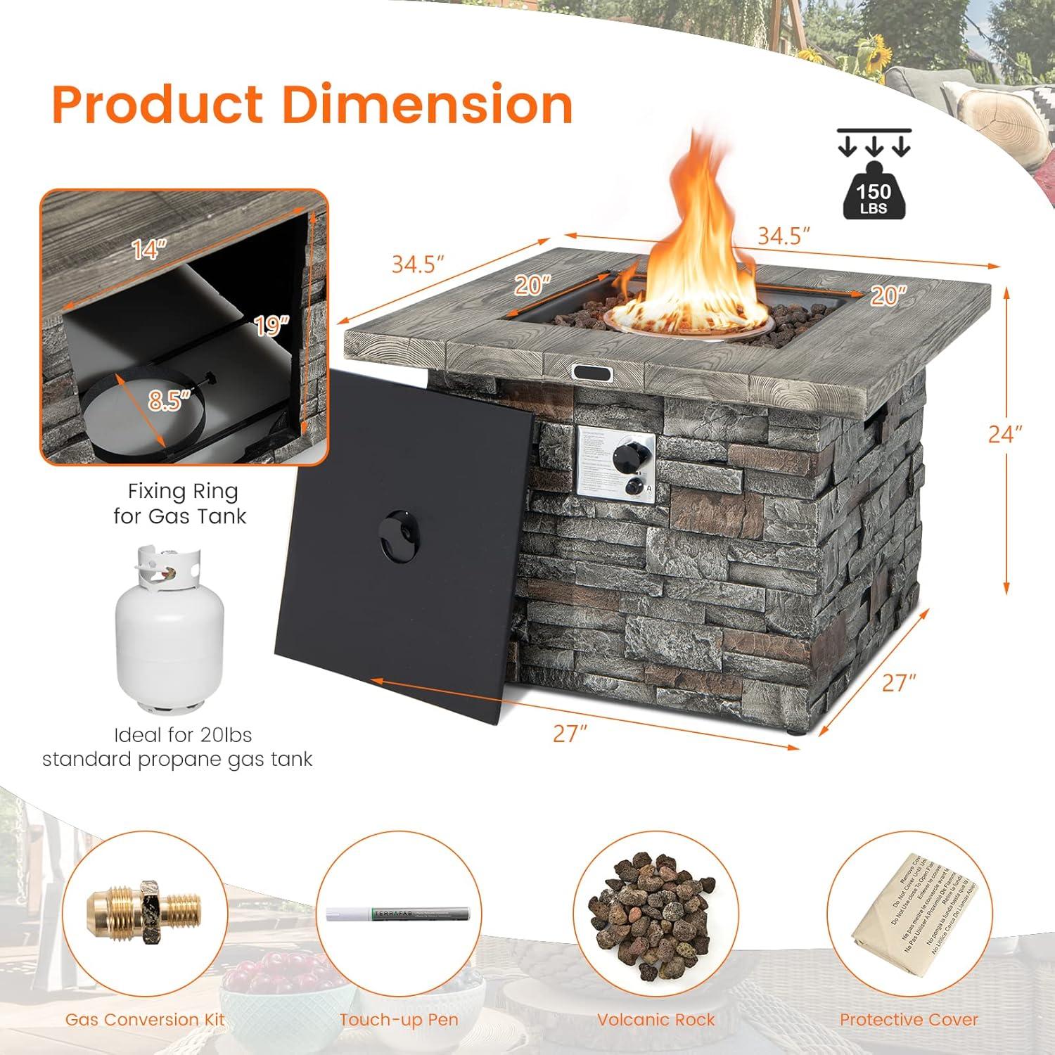 Complete Accessories: This outside fireplace will be delivered with a package of volcanic rocks, a touch-up pen, a gas conversion kit and a protective cover. Plus, there is no need to assemble, which saves much effort. Please note that 1 x AAA battery (not included) is required for the igniting device. And the fire pit table is available for standard 20 lbs propane tank (not included).