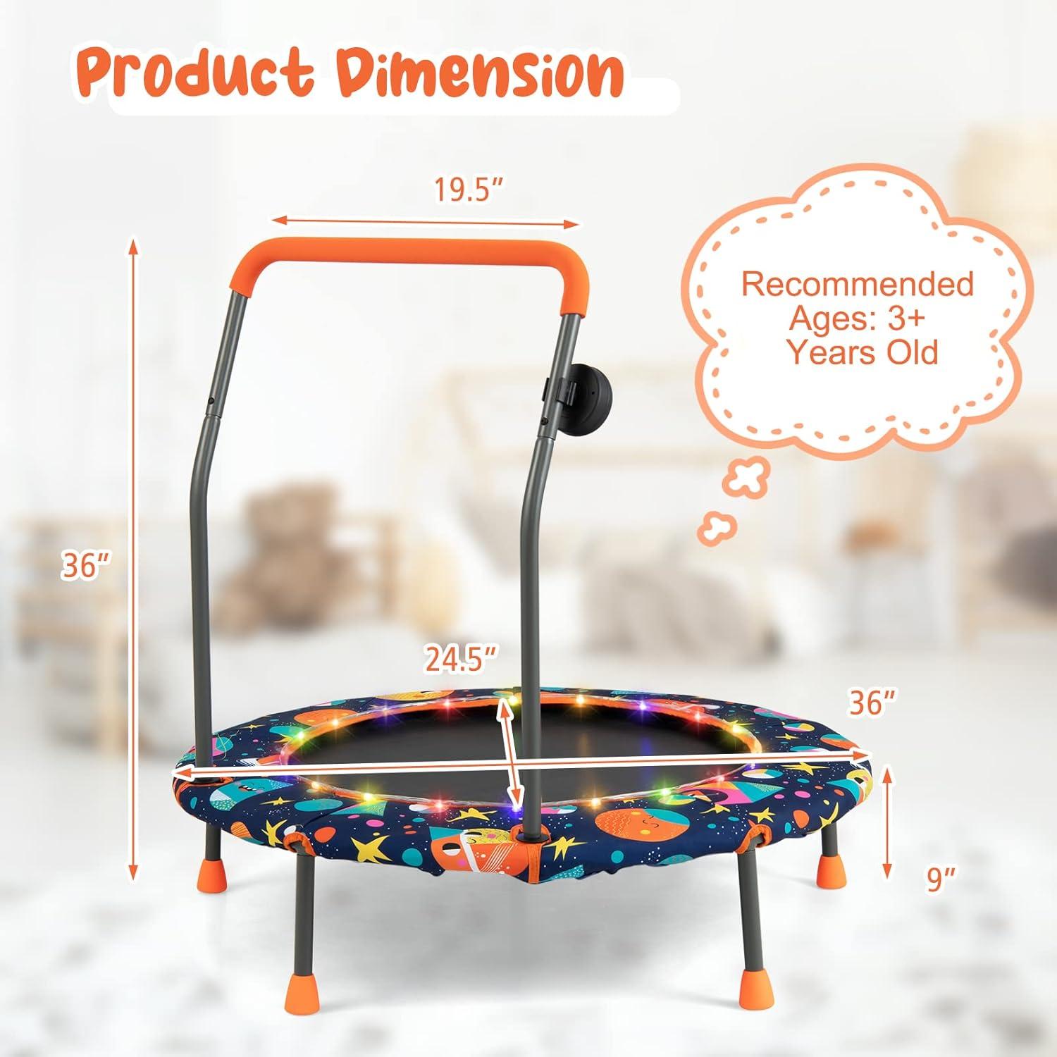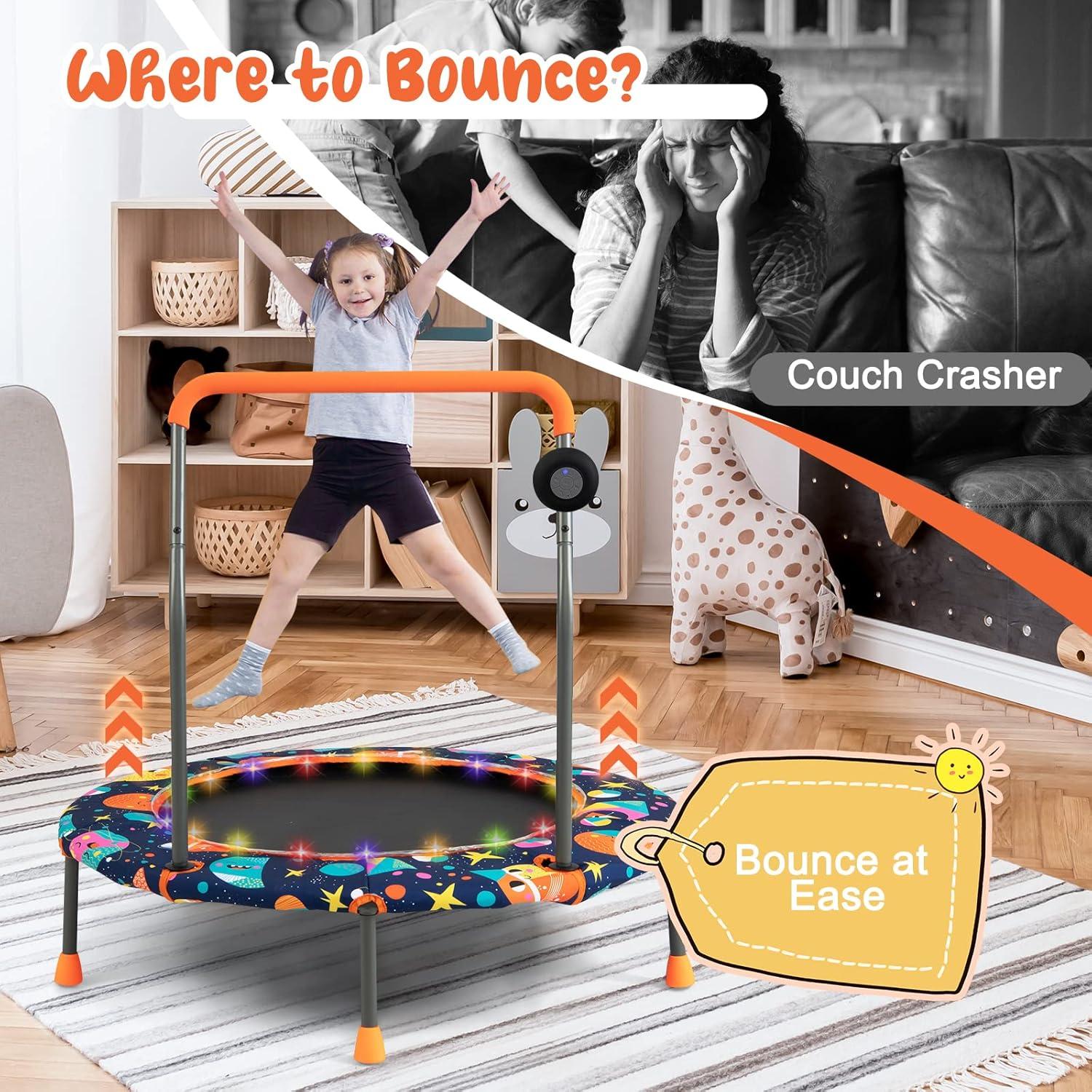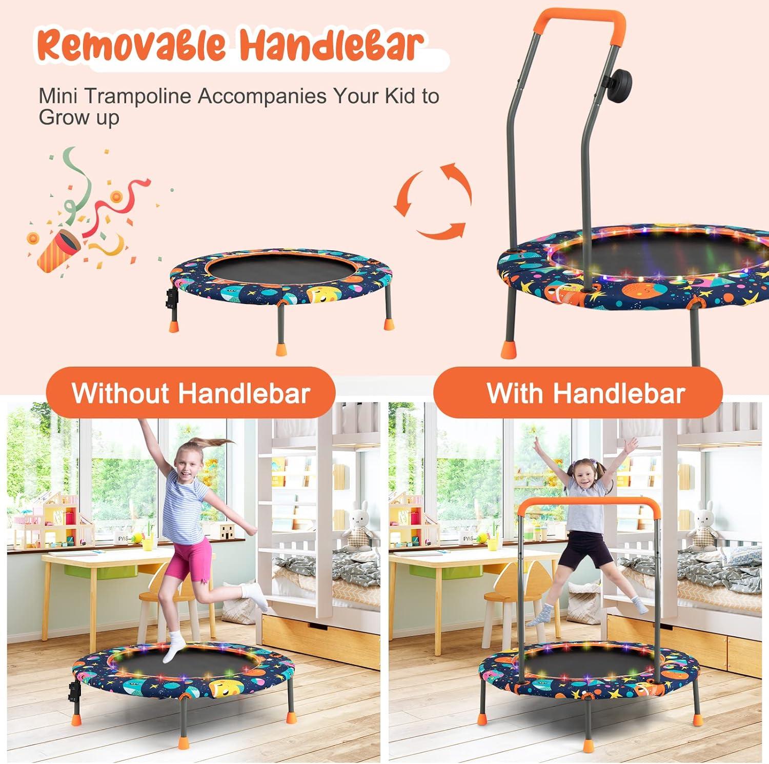 [Perfect Gift for Kids]: This mini recreational trampoline with music and lights brings endless fun and encourages motor skill development, which is ideal for active toddlers. Additionally, the removable handlebar with soft and non-slip foam cover offers better grip.