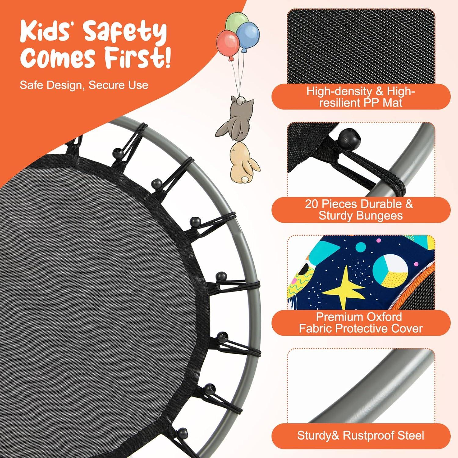 [ASTM Certified for Excellent Security]: With ASTM certification, our Giantex trampoline always put your child's safety first. The anti-tear PP jumping mat together with 20pcs high elastic bungee cords provides a stable and safe platform for kids to enjoy bouncing fun. In addition, this mini trampoline comes with a no-gap soft padded cover to protect kids' feet from getting stuck.