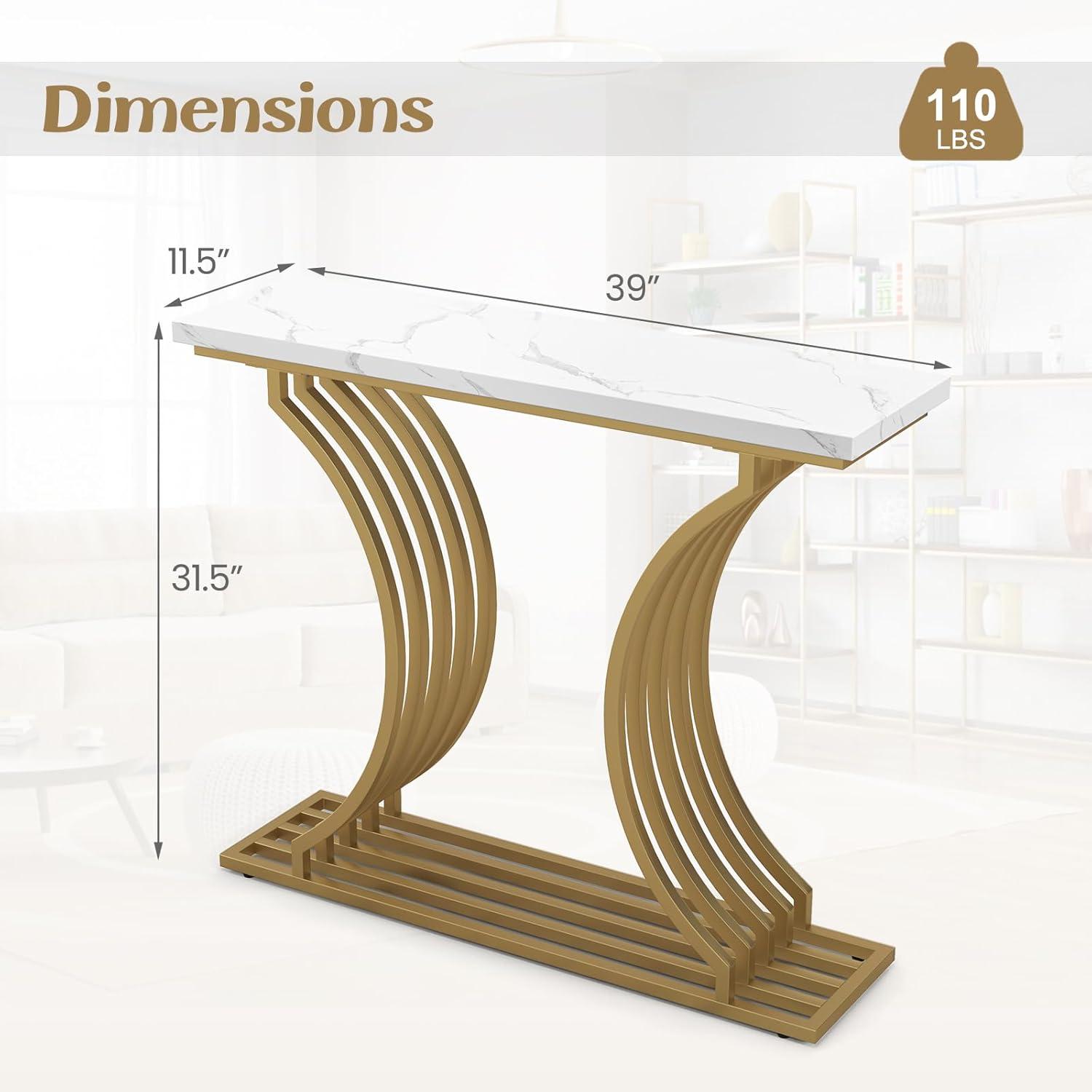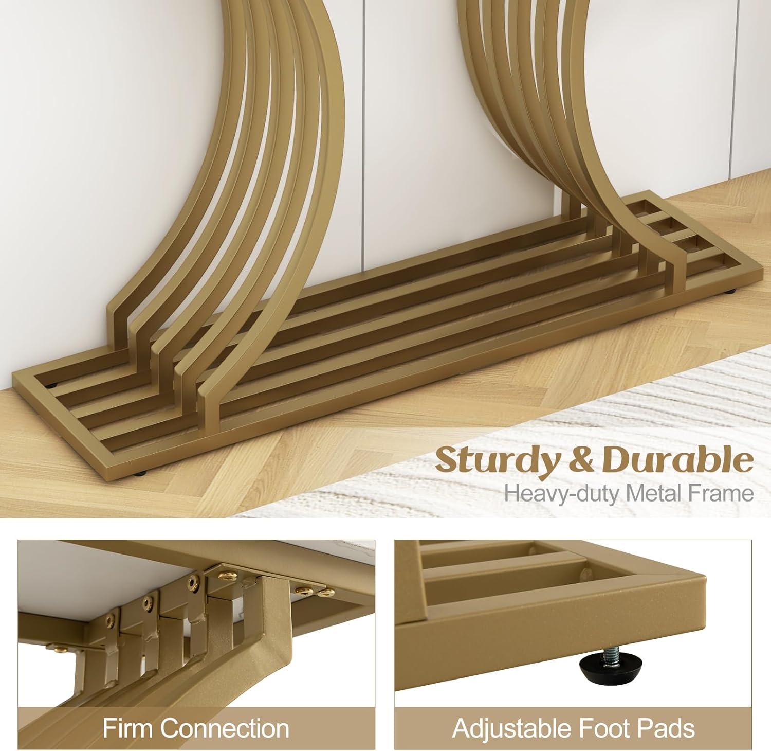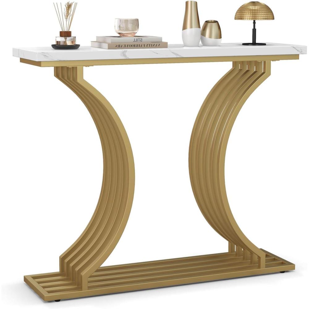 Elevate your space with our stunning console table! Immerse yourself in pure luxury with its lavish white faux marble tabletop and glamorous gold metal legs, instantly adding sophistication to any room. Crafted with durability in mind, this entryway table boasts a sturdy MDF construction and heavy-duty metal legs, ensuring it withstands the test of time. Its waterproof surface makes cleaning a breeze. Thus, this versatile piece functions beautifully as a hallway table, sofa table, or a fabulous vanity in your bedroom. Offering ample space, its bottom shelf adds convenience and functionality to your decor. Rest easy knowing it remains steady and secure with anti-tipping kits and adjustable foot pads that guarantee stability on any surface.