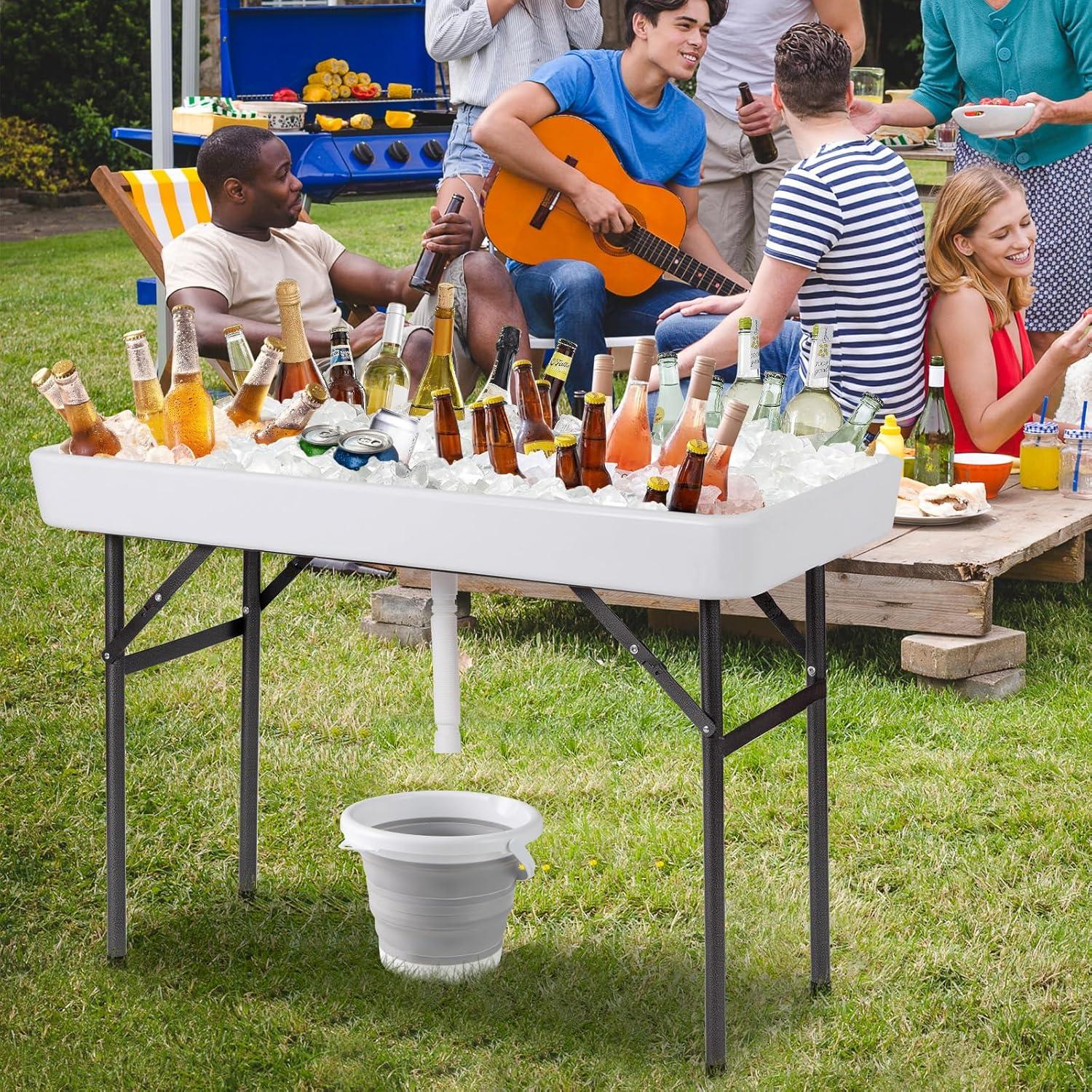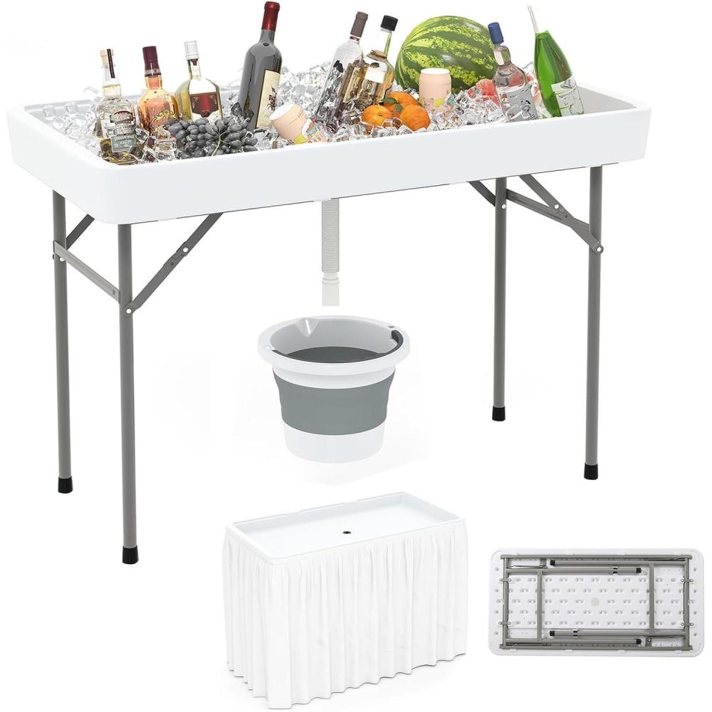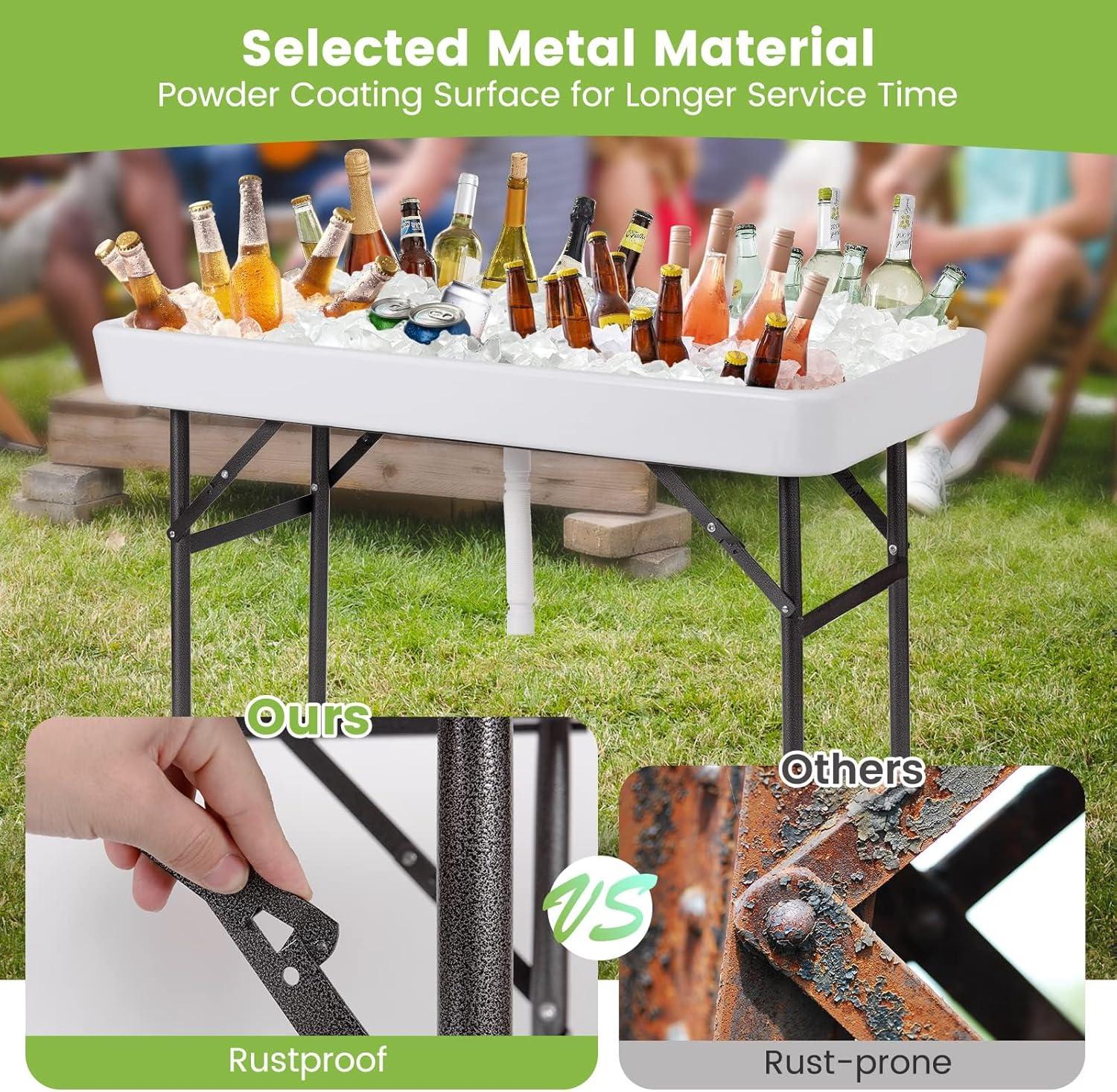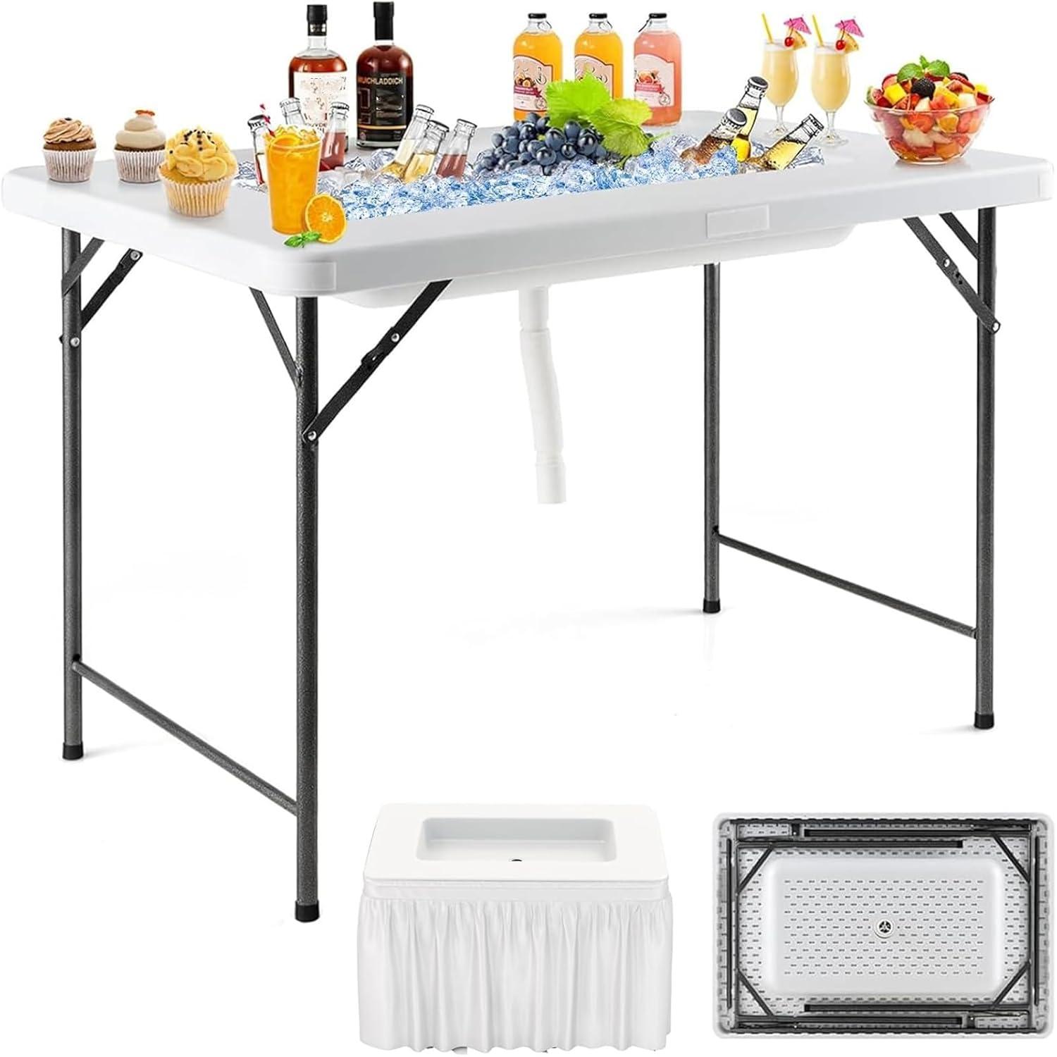 [ Foldable Ice Bin Table ]: Thanks to its underneath hinges, the table legs can be easily folded to save much space when not in use. And after being folded, this ice cooler table measures 48″ x 32″ x 6″ (L x W x H), which allows for easy storage and convenient transport.