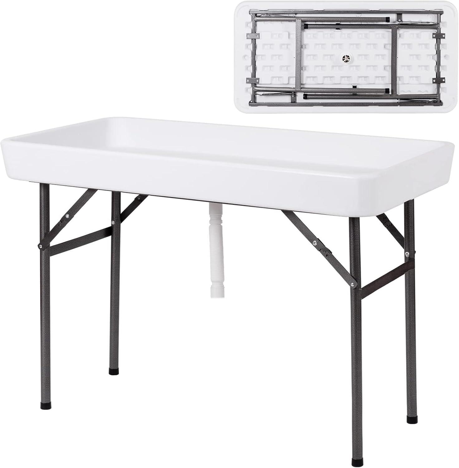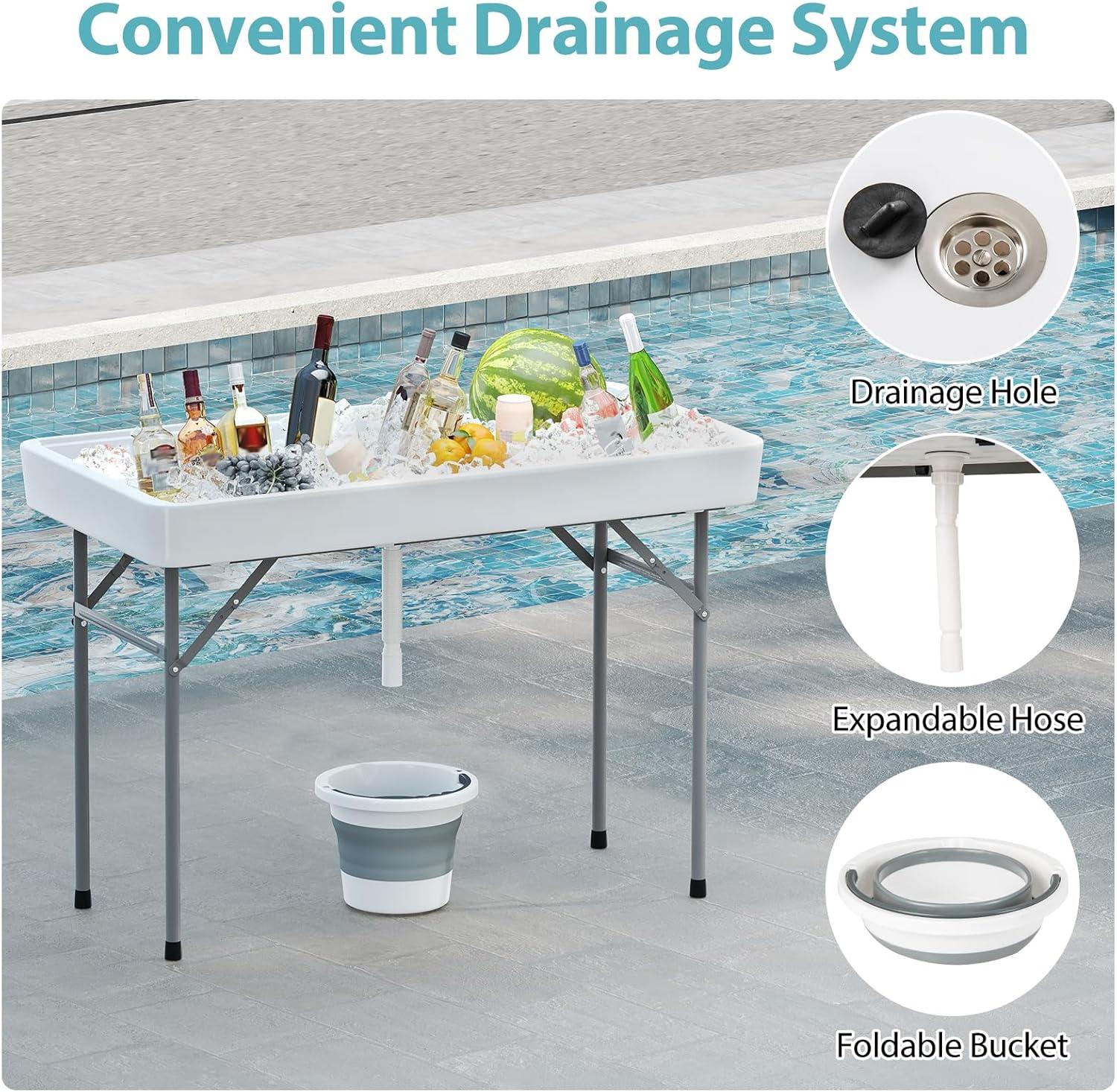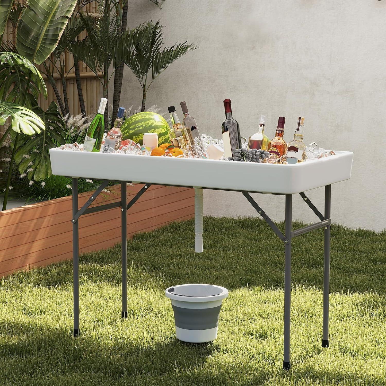 [ Foldable Ice Bin Table ]: Thanks to its underneath hinges, the table legs can be easily folded to save much space when not in use. And after being folded, this ice cooler table measures 48″ x 32″ x 6″ (L x W x H), which allows for easy storage and convenient transport.