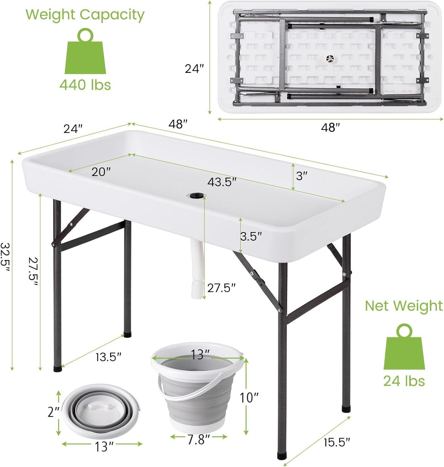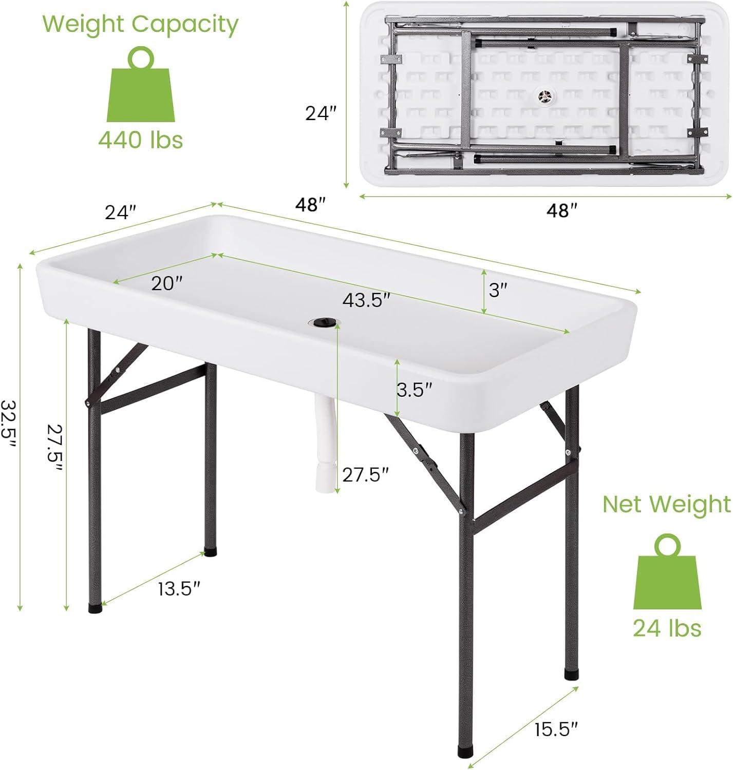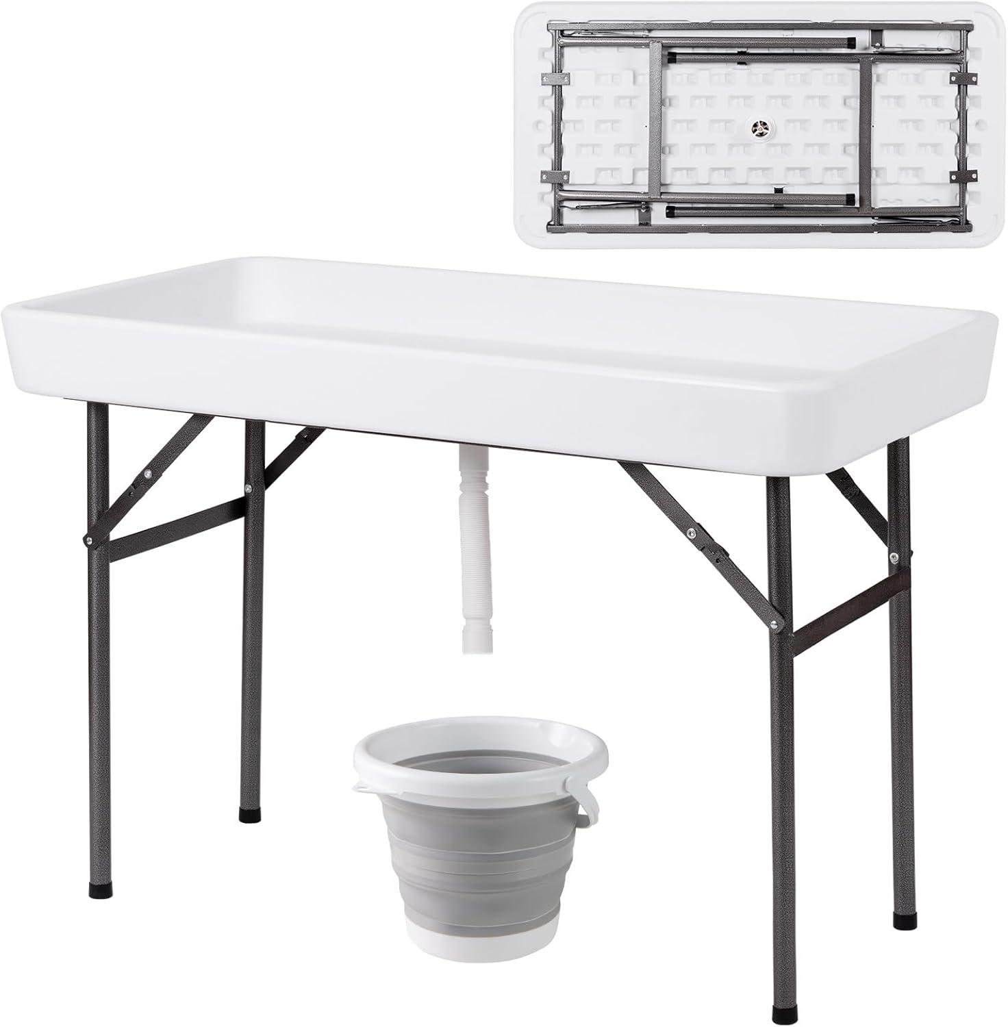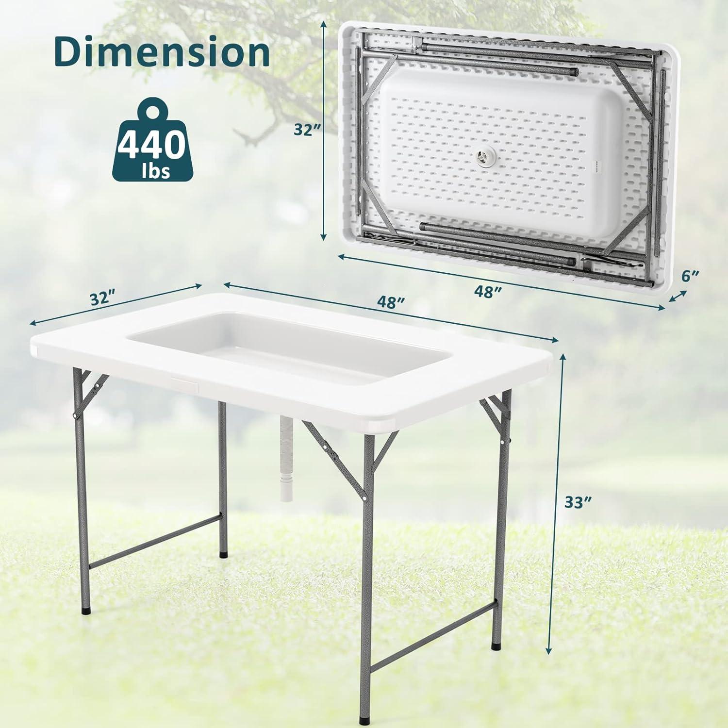 [ Foldable Ice Bin Table ]: Thanks to its underneath hinges, the table legs can be easily folded to save much space when not in use. And after being folded, this ice cooler table measures 48″ x 32″ x 6″ (L x W x H), which allows for easy storage and convenient transport.