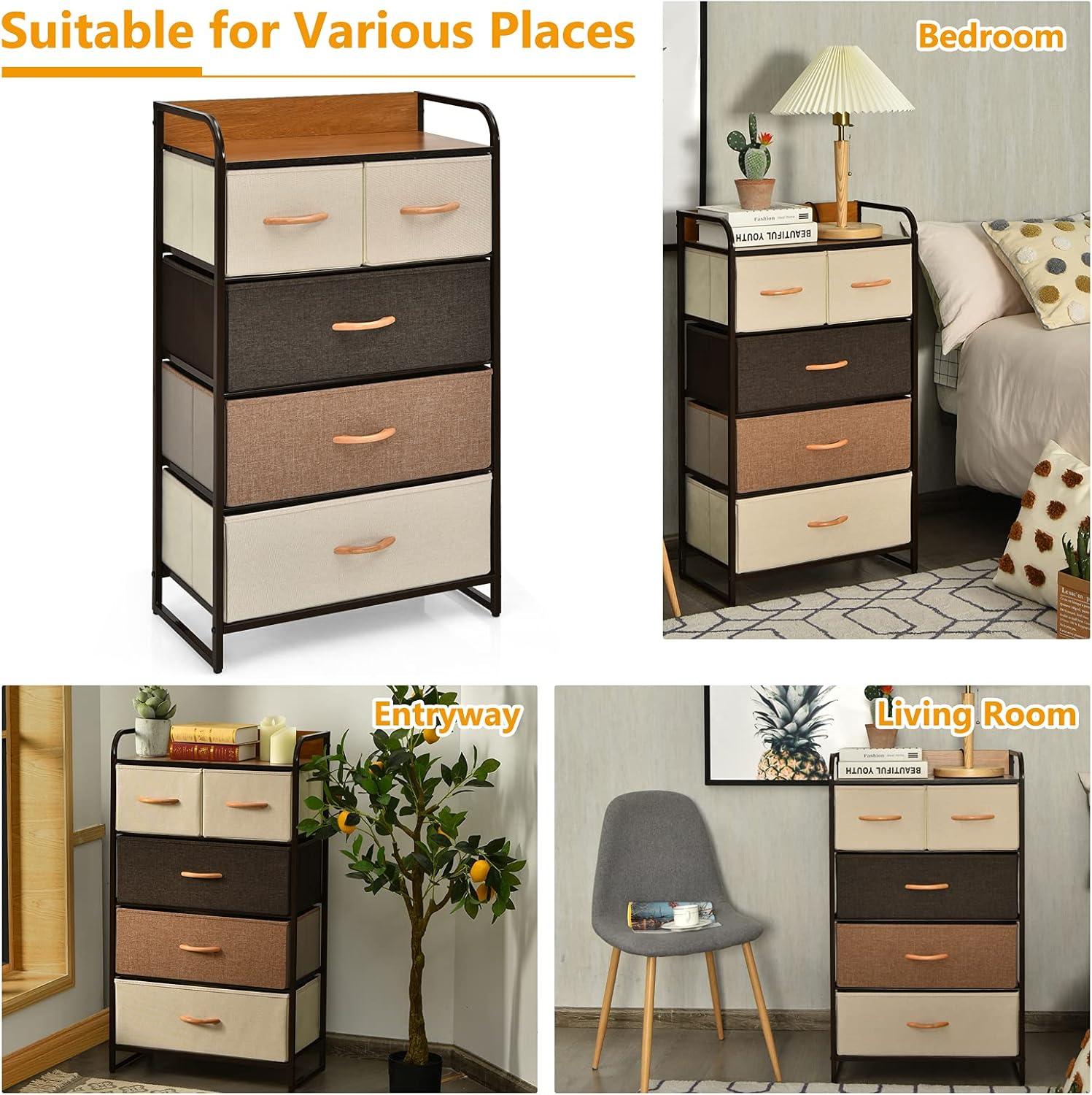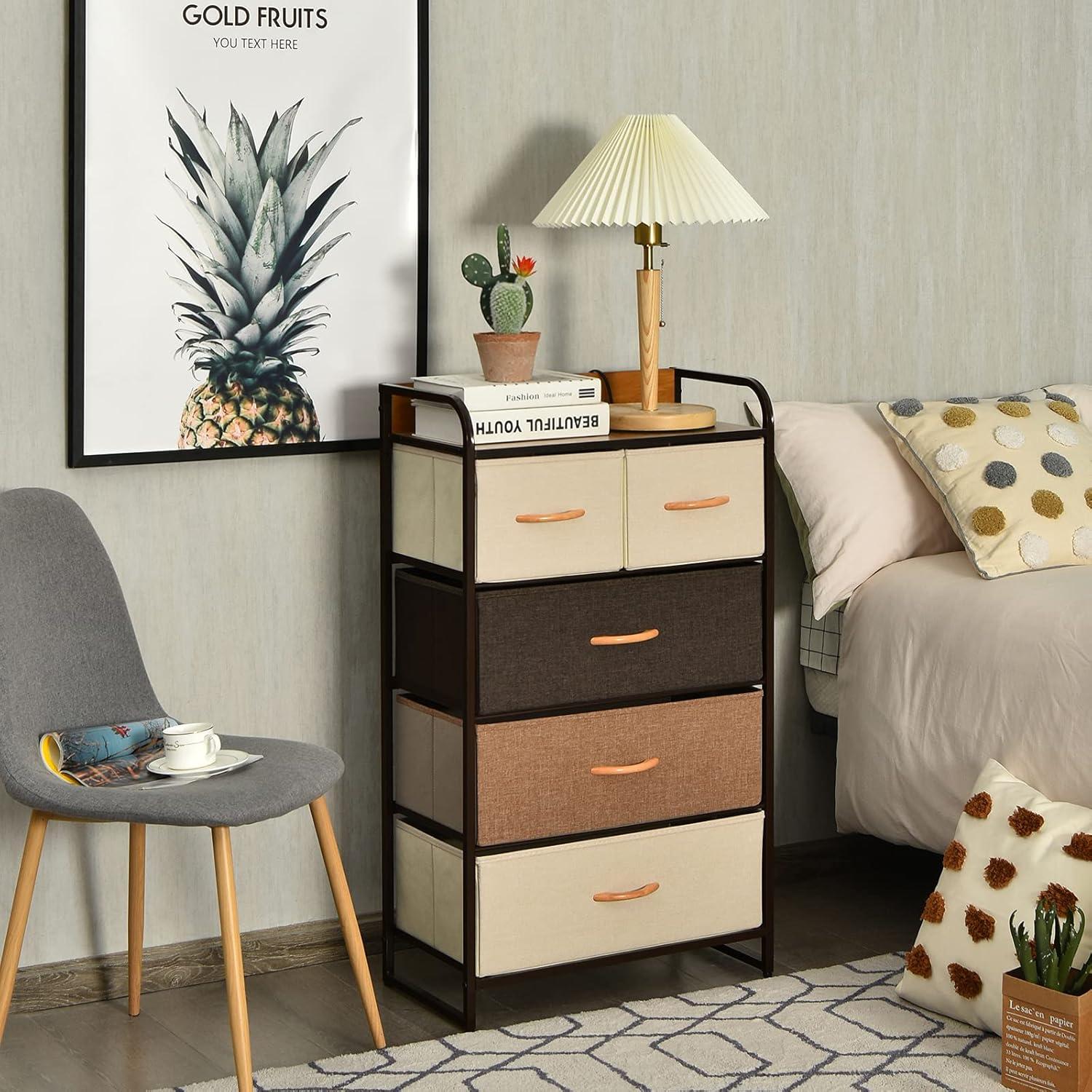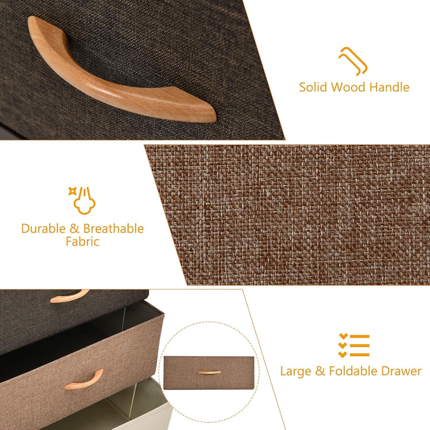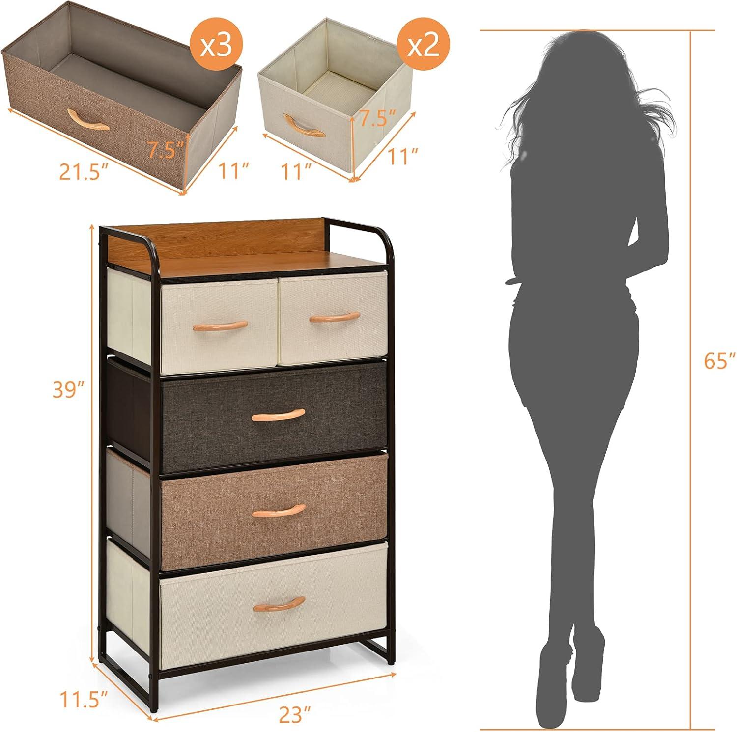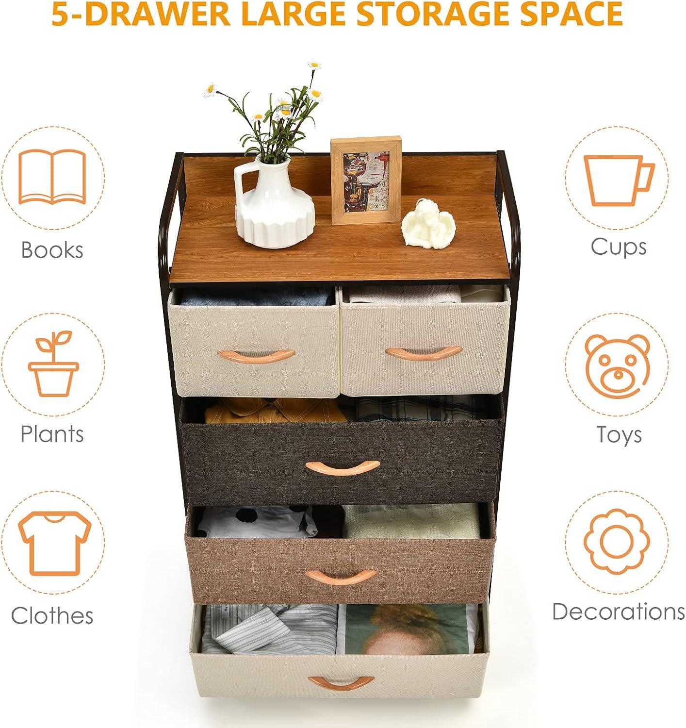 This dresser storage tower with 5 foldable drawers offers a solution for keeping your items neatly organized to maximize space and maintain tidiness in any room. The high-grade fabric drawers can help preserve the condition of your belongings. Its modern design seamlessly complements your home decor, making it suitable for various areas such as the bedroom, nursery, laundry room, living room, hallway, and closets. Built with a sturdy metal frame and MDF top, this cabinet ensures strong stability. Its lightweight and compact design make this 5-drawer dresser chest stand portable and simple to move and assemble, providing convenience and functionality for your home.