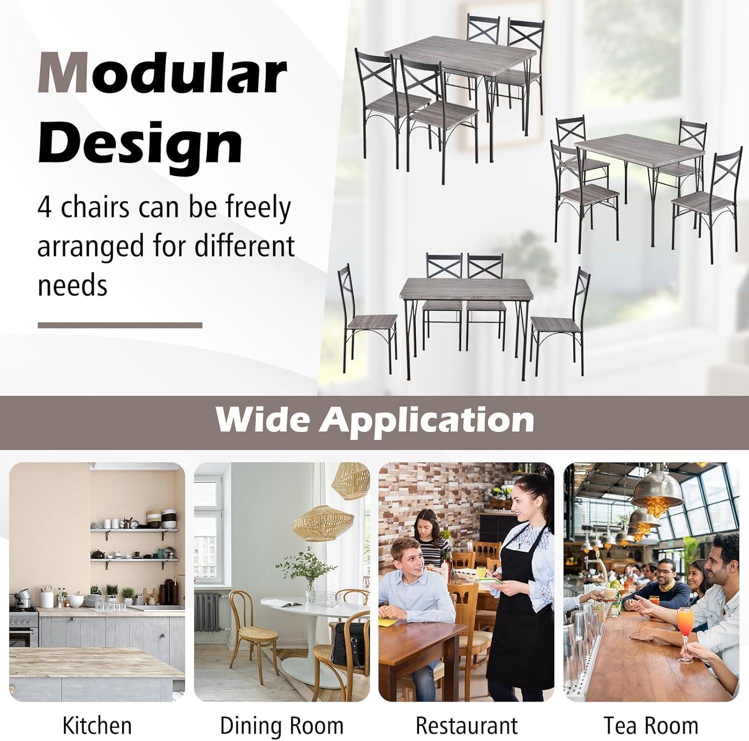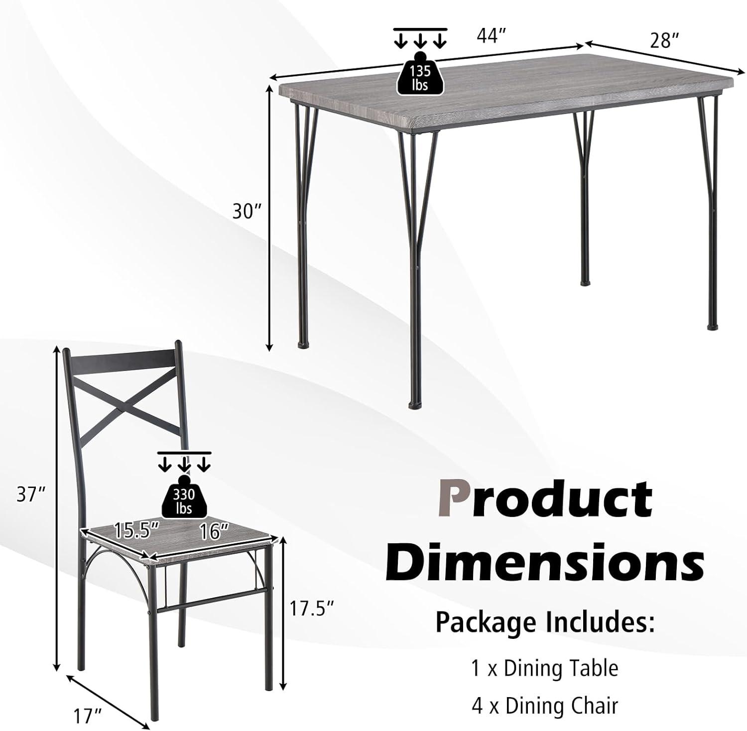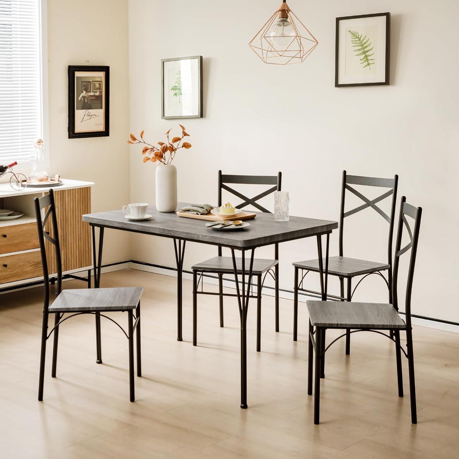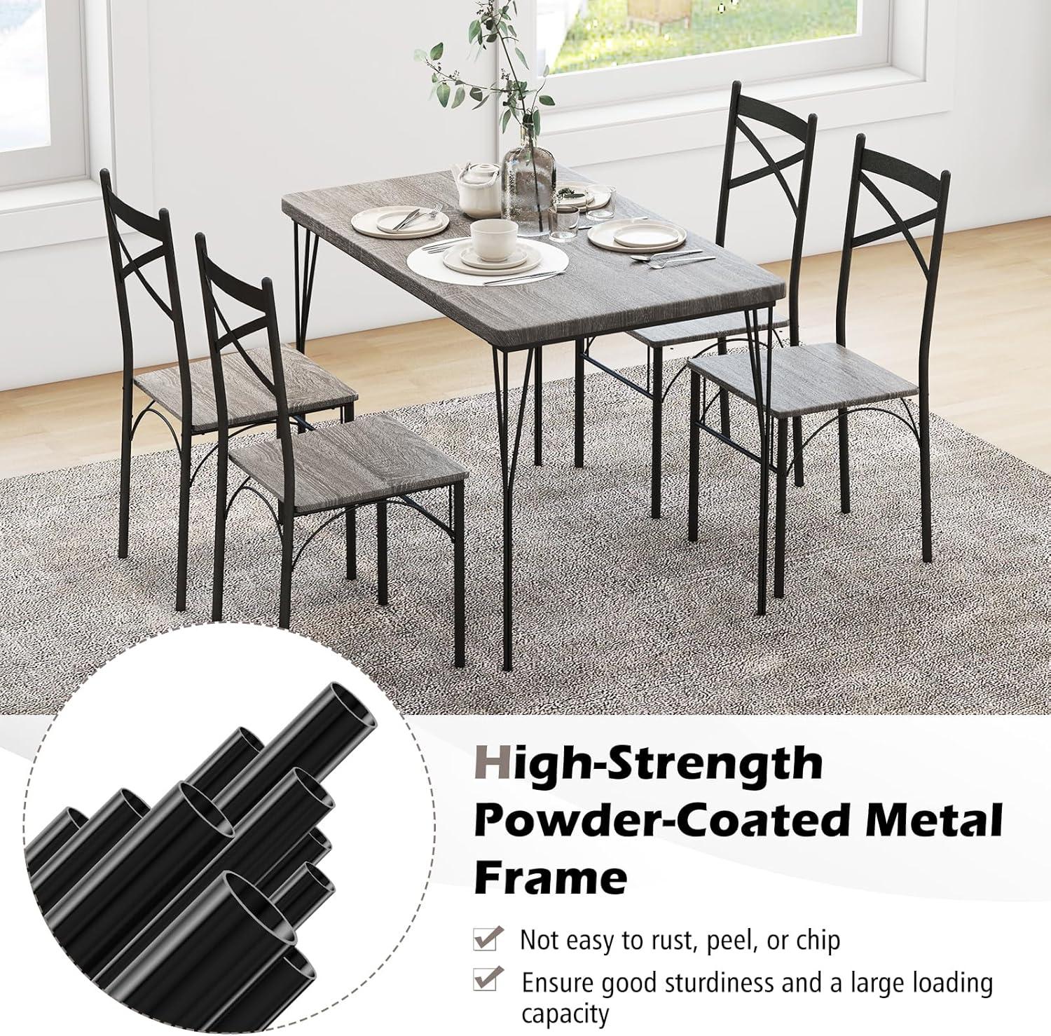 Our 5-piece dining table set features a rectangular dining table and 4 chairs, which can accommodate up to 4 people to enjoy dining or refreshments. Built with a robust metal frame, our set ensures stability and durability throughout the years. Featuring a spacious tabletop, our dining table provides ample room for meals and gatherings, making it perfect for families and small gatherings. Its easy-to-clean surface saves you time and effort, allowing for hassle-free maintenance. When not in use, you can also store 4 chairs under the table, saving floor space. Moreover, the chairs are ergonomically designed to provide comfort and support during extended periods of use. With its sleek and modern appearance, our dining table set complements any home decor, making it suitable for various scenes like dining rooms, kitchens, cafes, and more.