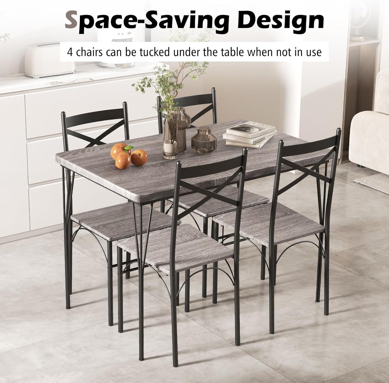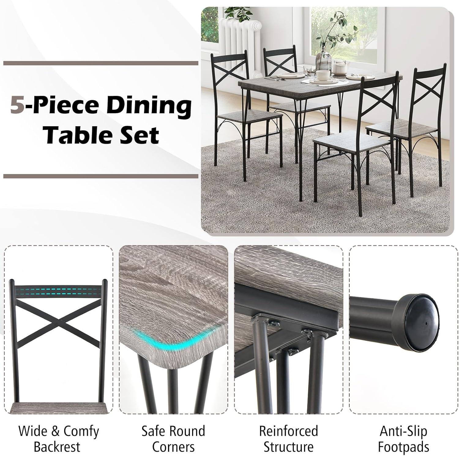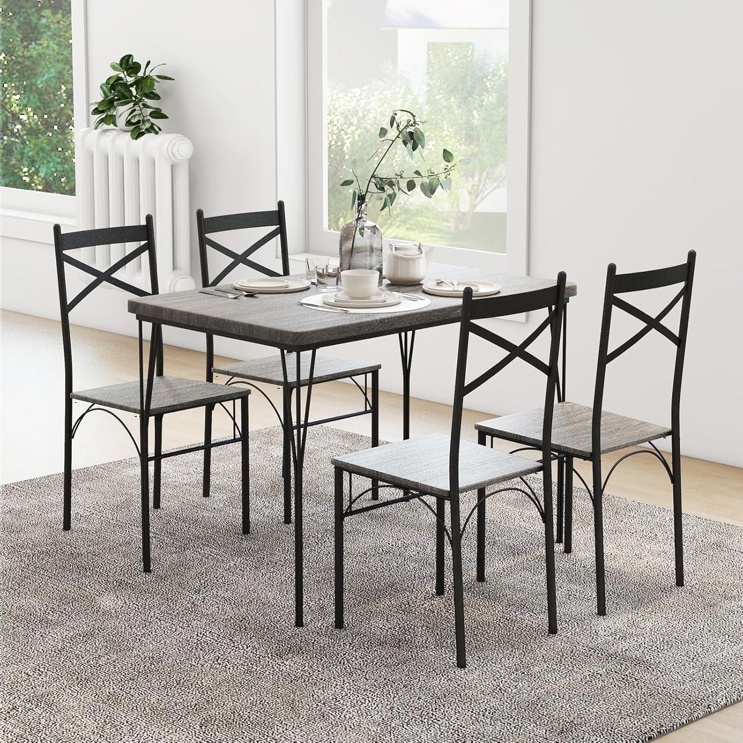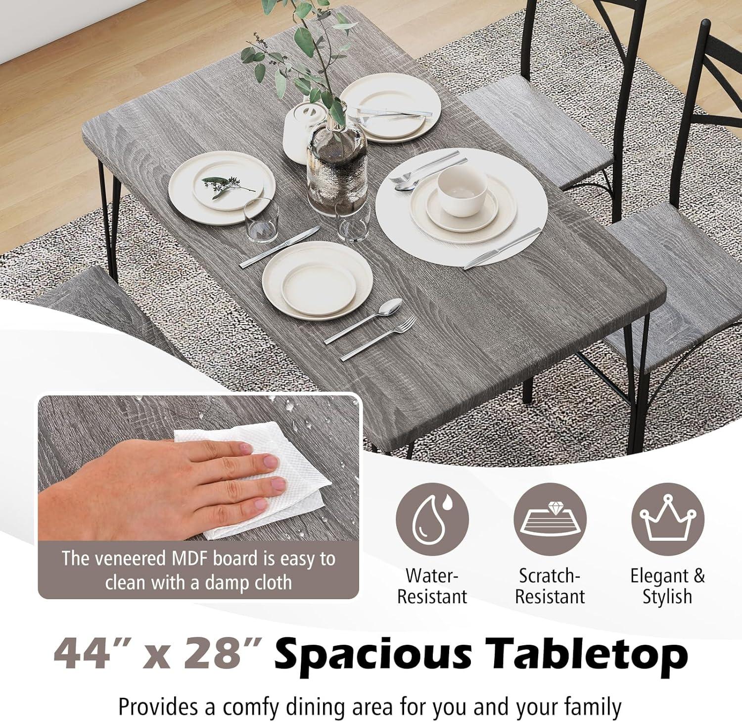 Our 5-piece dining table set features a rectangular dining table and 4 chairs, which can accommodate up to 4 people to enjoy dining or refreshments. Built with a robust metal frame, our set ensures stability and durability throughout the years. Featuring a spacious tabletop, our dining table provides ample room for meals and gatherings, making it perfect for families and small gatherings. Its easy-to-clean surface saves you time and effort, allowing for hassle-free maintenance. When not in use, you can also store 4 chairs under the table, saving floor space. Moreover, the chairs are ergonomically designed to provide comfort and support during extended periods of use. With its sleek and modern appearance, our dining table set complements any home decor, making it suitable for various scenes like dining rooms, kitchens, cafes, and more.
