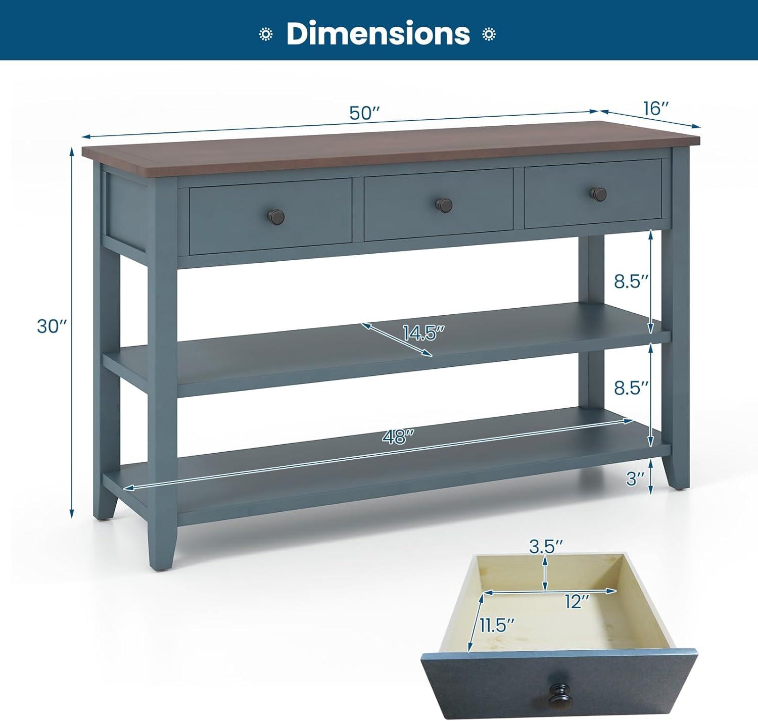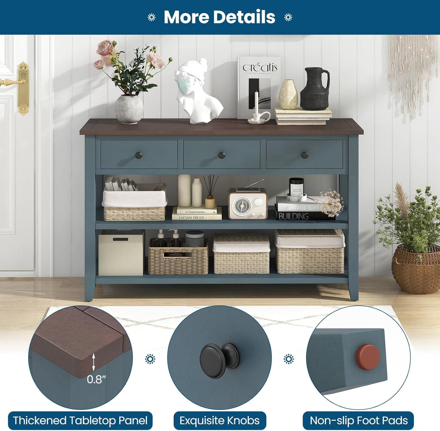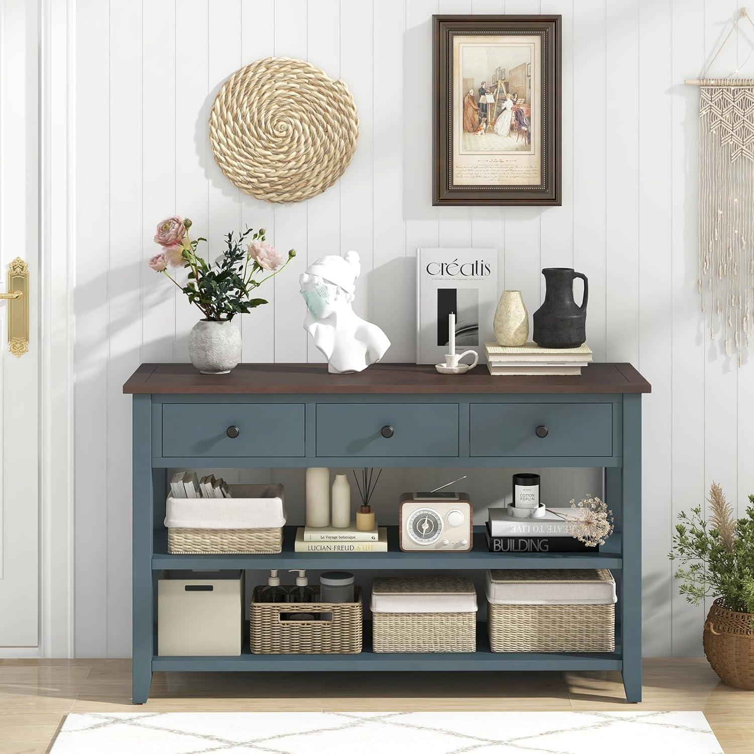 Its sleek, elongated design effortlessly fits into tight spaces while offering a generous tabletop for your treasures. Revel in the convenience of 3 pre-installed drawers and 2 open shelves, keeping clutter at bay with ease. Solid wood legs, fortified with non-slip pads, ensure steadfast support. Embrace safety with 2 anti-tipping kits, perfect for families and pet lovers. Complete your home's look with our table's inviting farmhouse finish – rustic elegance at your doorstep. Bring this stylish and safe addition to your home!