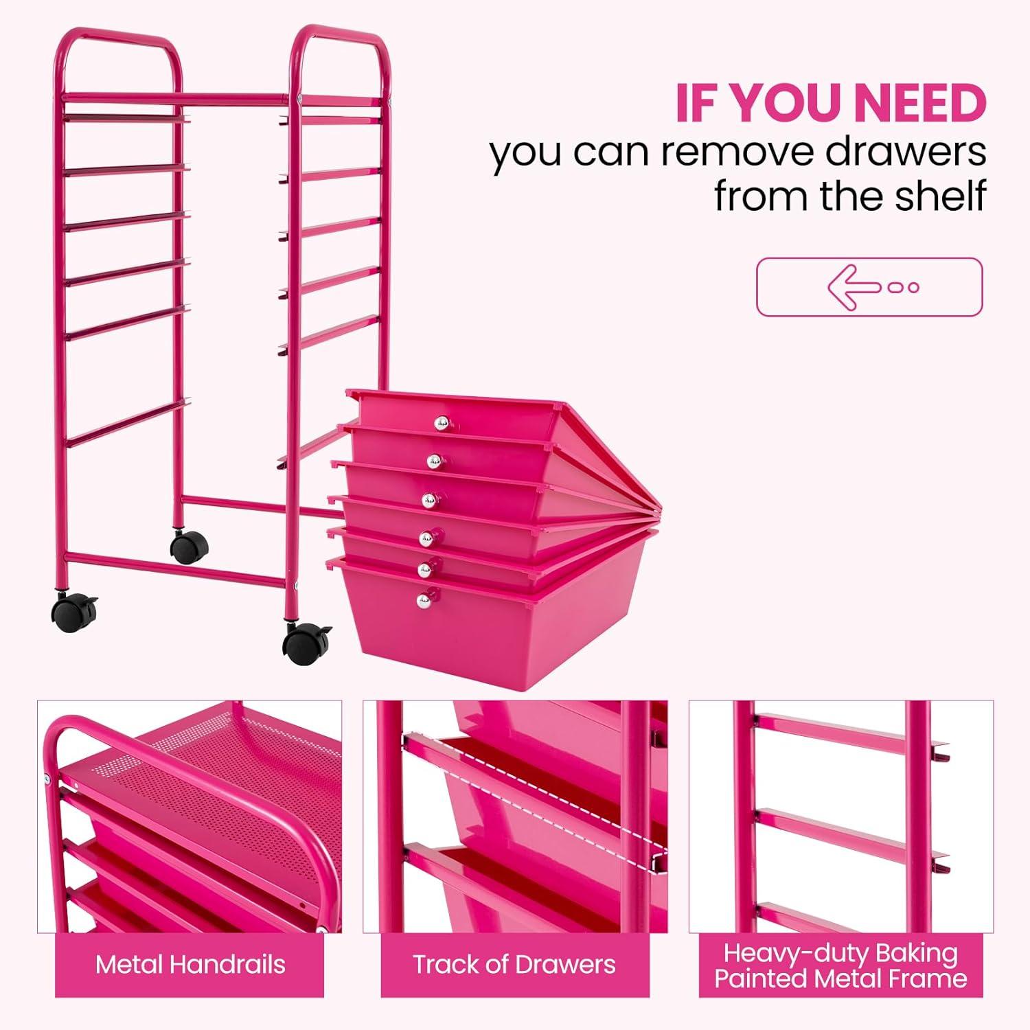 imageGiantex 6 Storage Drawer Cart Rolling Organizer Cart for Tools Scrapbook Paper Home Office School Multipurpose Mobile Utility Cart IvoryHot Pink