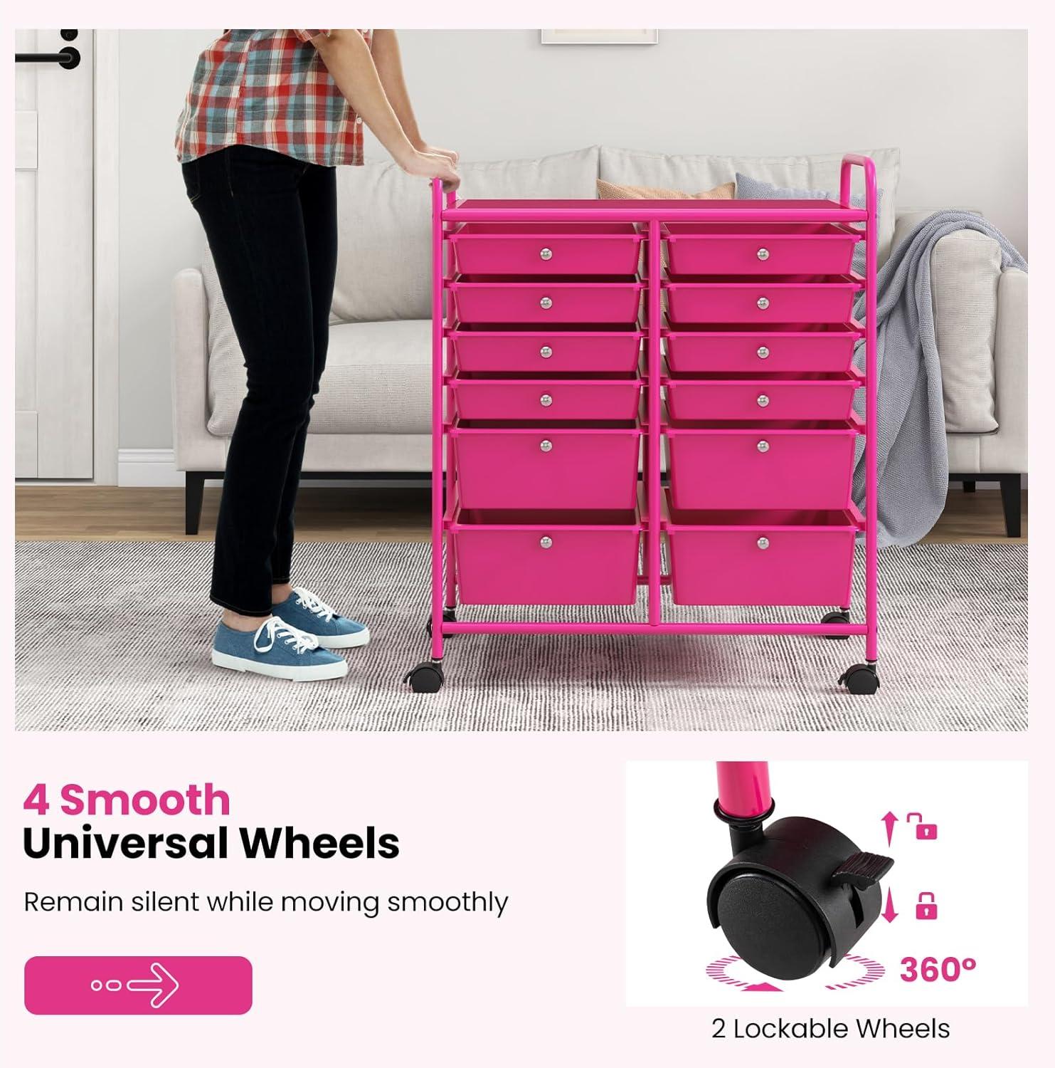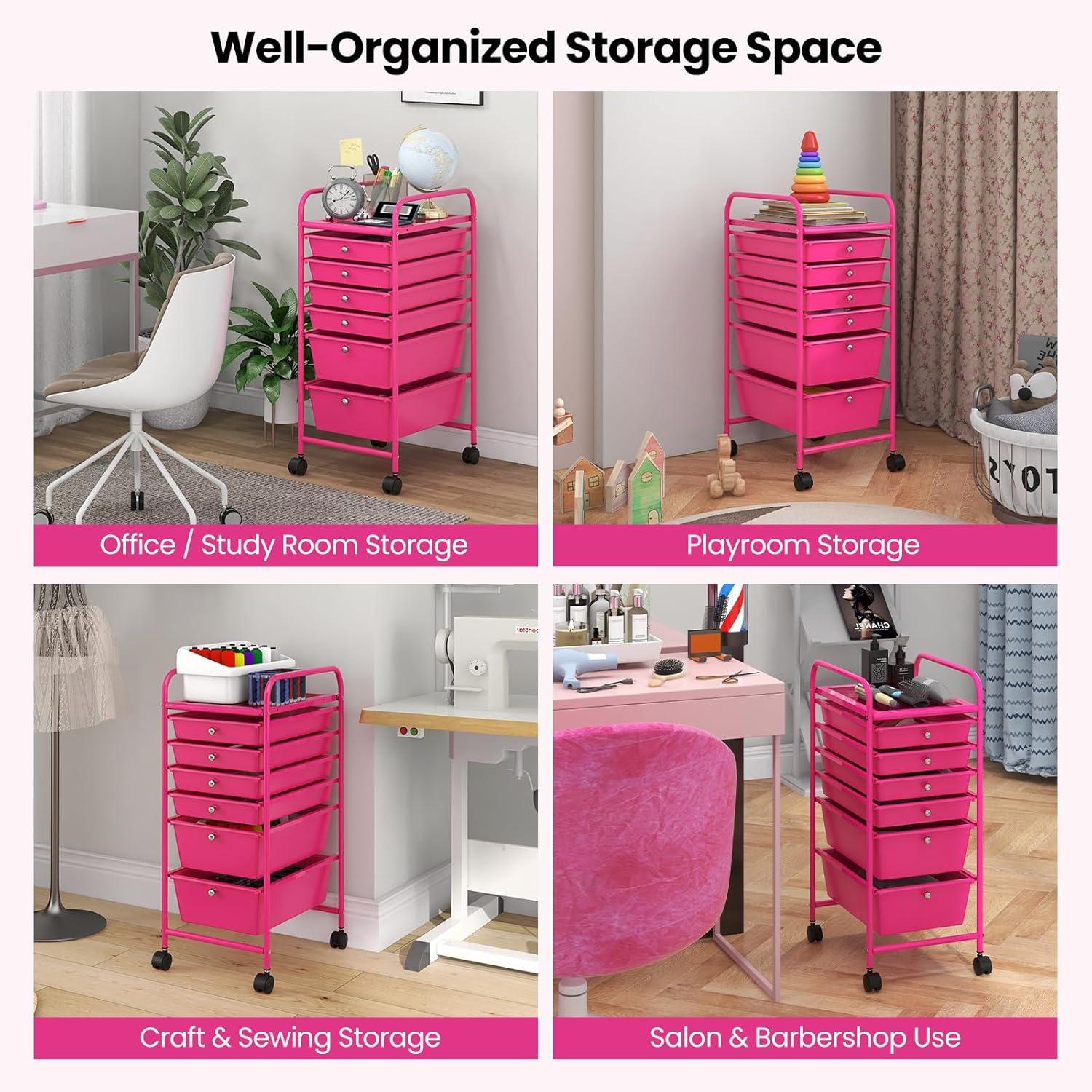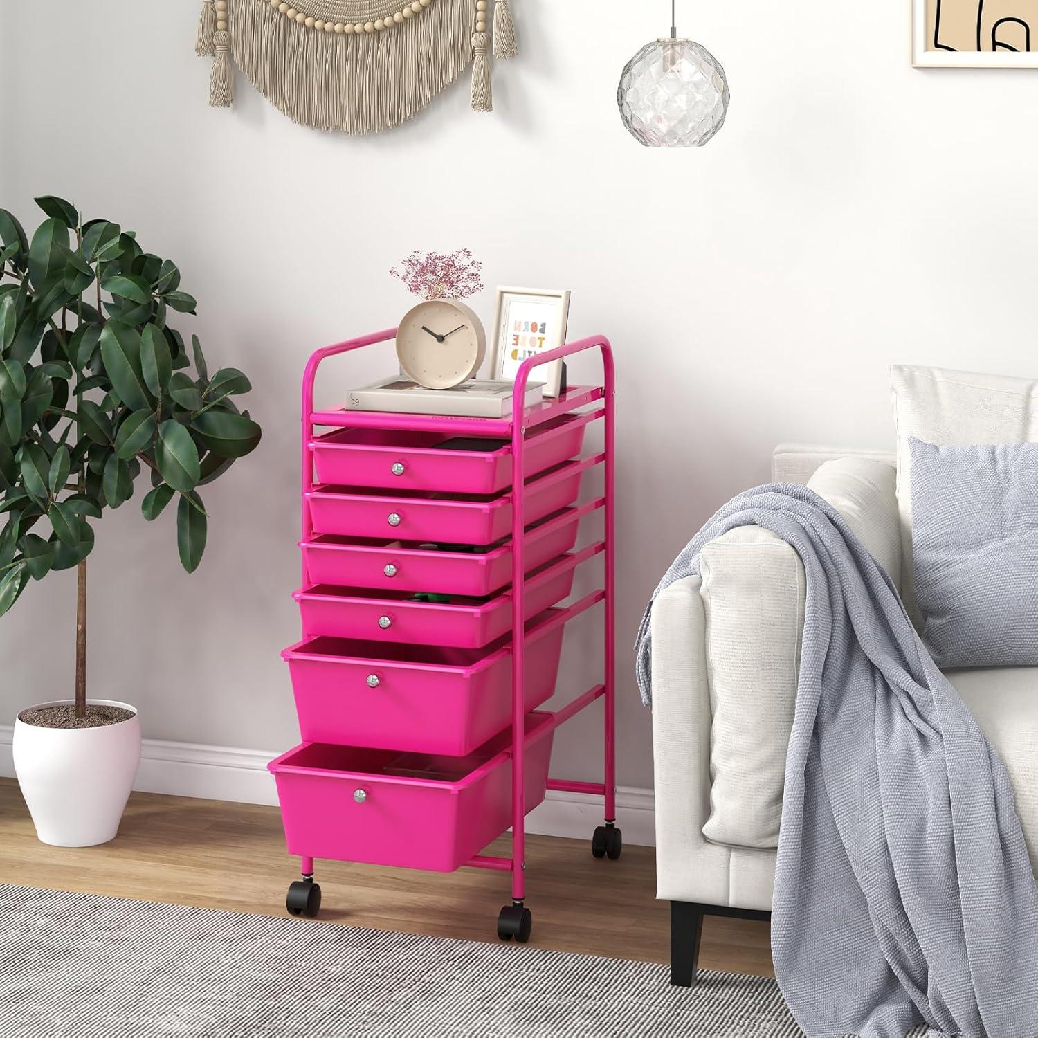 Giantex 6 Storage Drawer Cart Rolling Organizer Cart for Tools Scrapbook Paper Home Office School Multipurpose Mobile Utility Cart (Ivory)(Hot Pink)