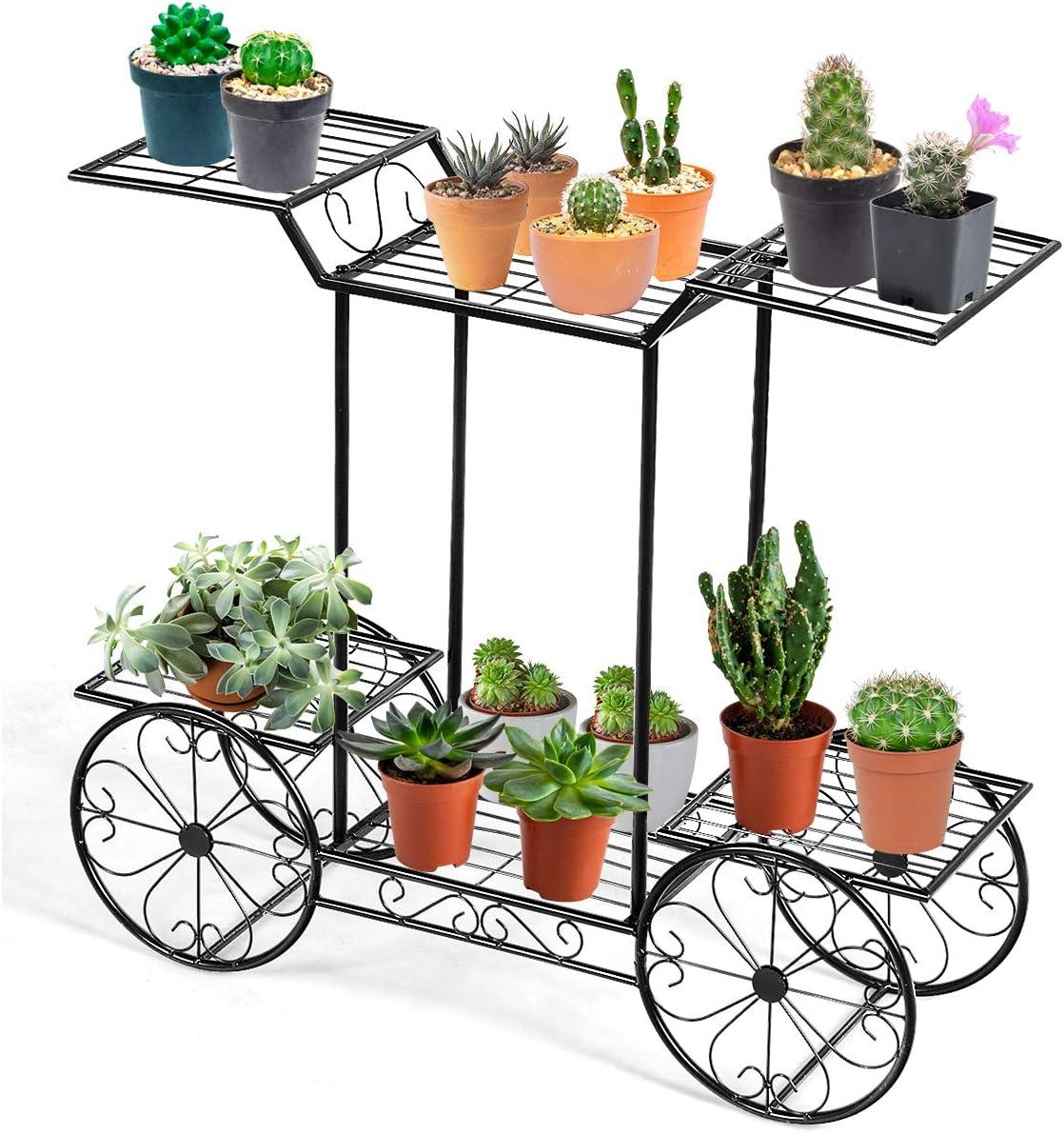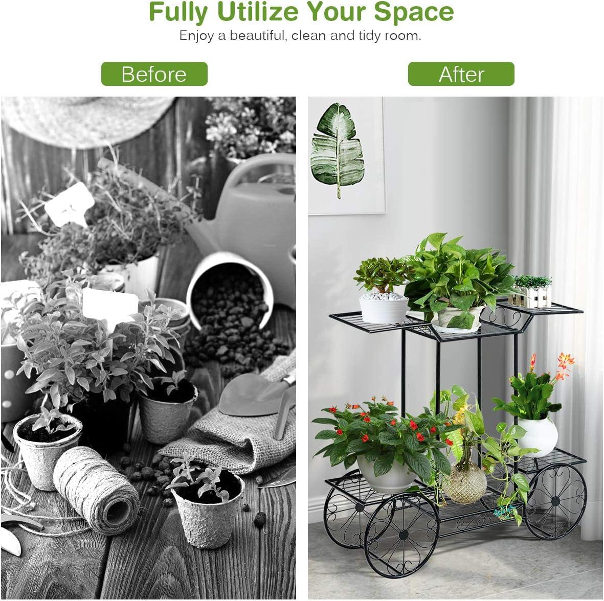 [Sturdy and Durable Metal Construction]Made of metal material with black powder coated finish, this flower pot holder shelf is not easy to rust and do well in outdoor. It can support approximately 2-3 items per tier depending on size.