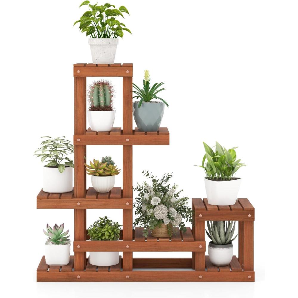 The 6 tier plants stand provides 10 panels to hold your potted plants. Or you can use it as a storage rack for shoes, tools, decorations.Besides, the versatile plant stand with high-low ladder design enables potted plants of varying heights to receive sunlight. And there are hallow-out rack facilitates drainage. Made of high-quality shorea wood, which features the characteristics of excellent sturdiness and durability, our wooden plant stand is solid and durable enough for long-term use. With clever vertical design and natural wood grain, the wood plant rack is suitable for various occasions, such as bedroom, balcony, patio. After choosing our plant stand, you will find the right place to display your plants. Besides, complete accessories and details instruction facilitate easy assembly.