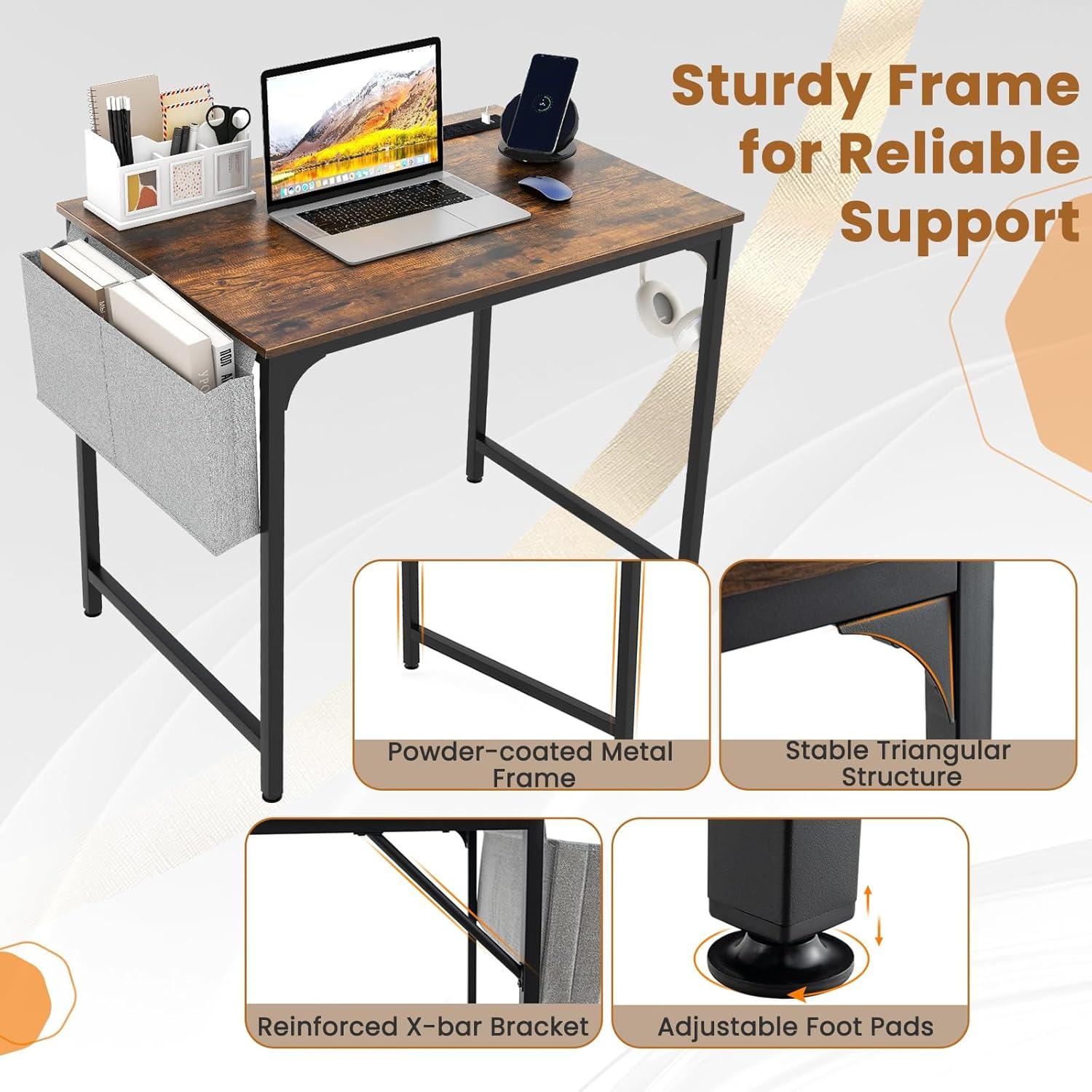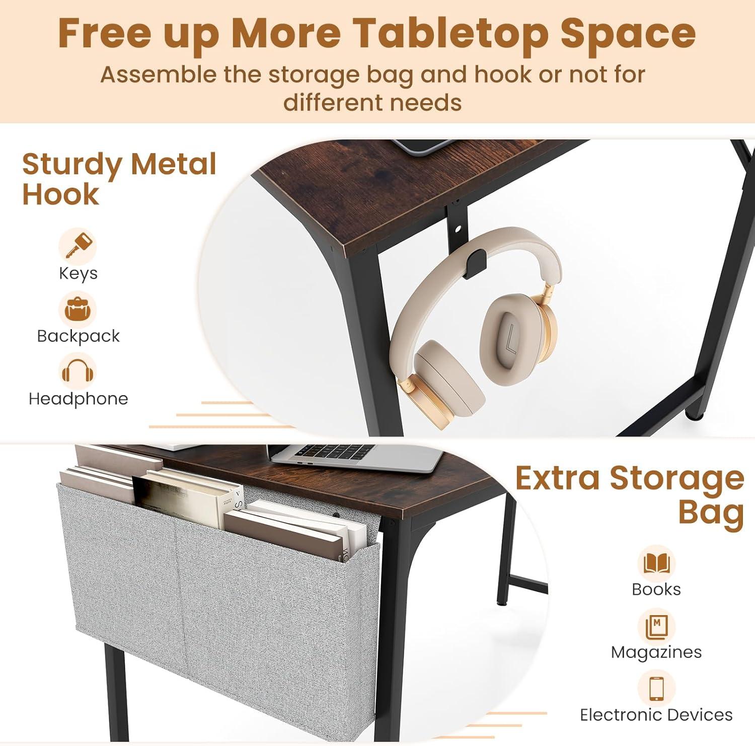 Upgrade your workspace with this computer desk! The built-in charging station eliminates the need for searching for outlets or dealing with messy cords. The ample desktop surface provides plenty of room for your computer, accessories, and documents. A bonus storage bag and headphone hook keep your essentials organized, thus to free up more tabletop space. Other than that, built on a sturdy metal frame, our computer workstation promises unparalleled stability and support. Marrying functionality with elegance, the sleek desk beautifies your home office while providing practicality.