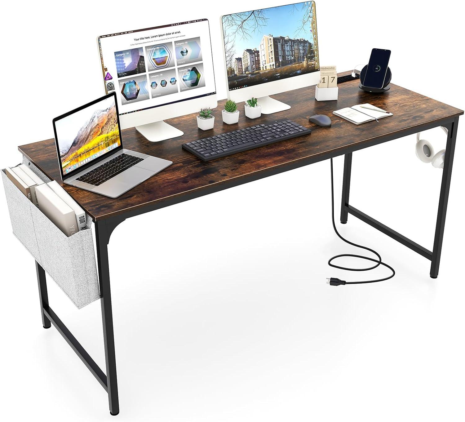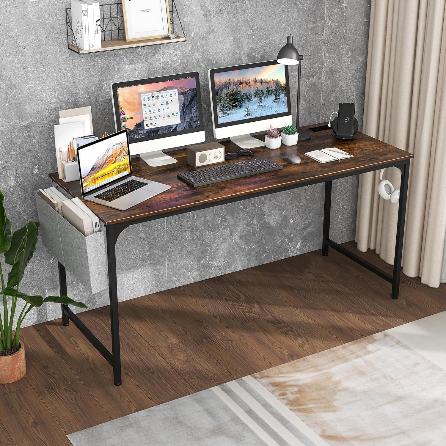 Giantex 60 Inch Computer Desk with Charging Station, Home Office Writing Desk with Storage Bag & Headphone Hook, Large Gaming Table PC Workstation, Modern Simple Laptop Desk for Bedroom, Study(Rustic Brown)