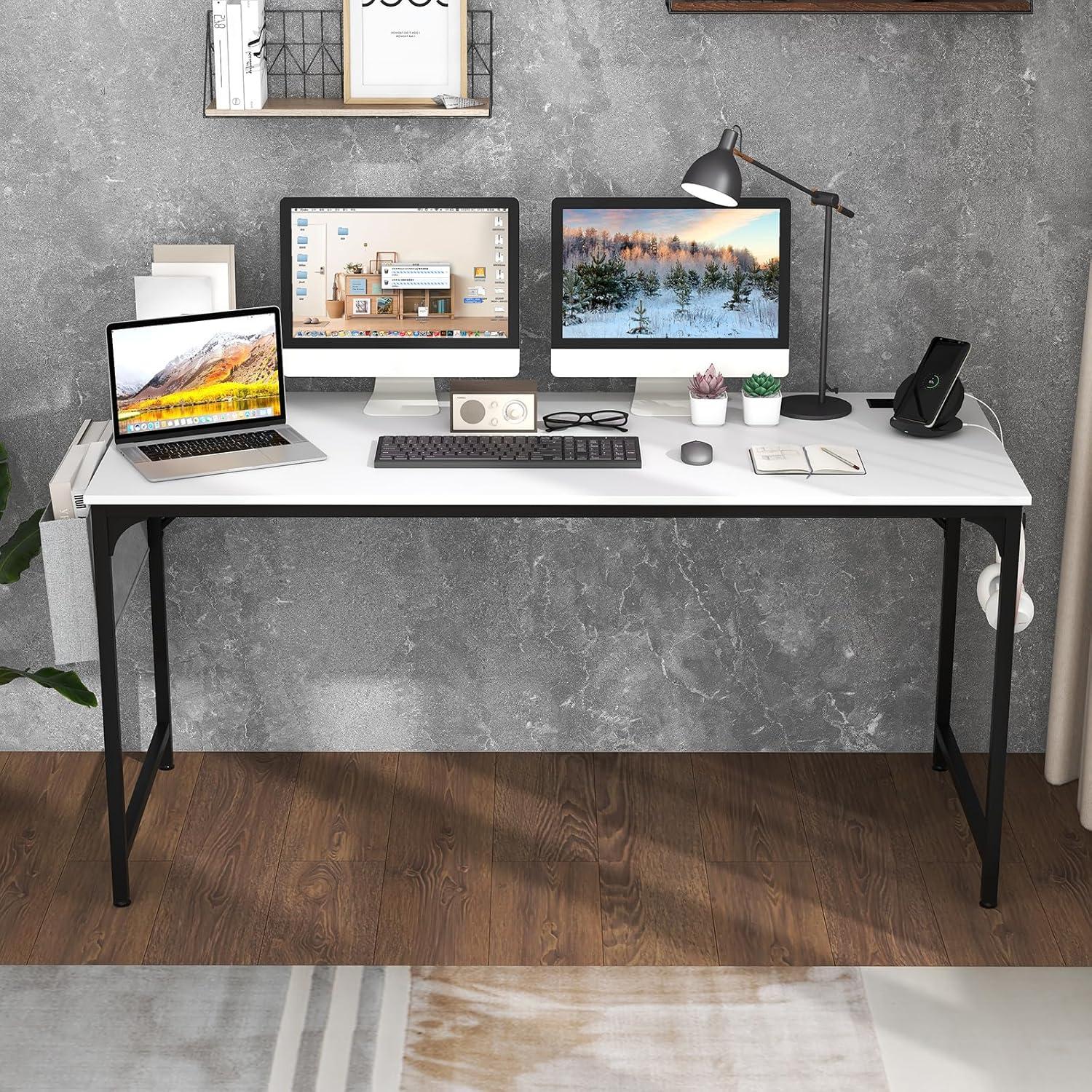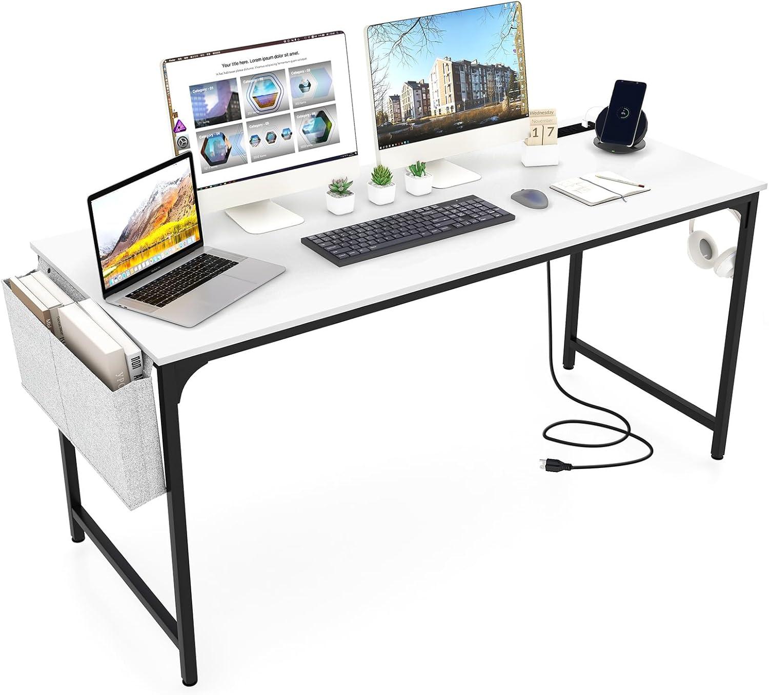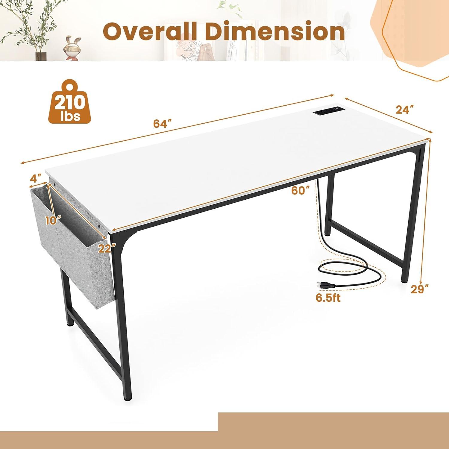 Giantex 60 Inch Computer Desk with Charging Station, Home Office Writing Desk with Storage Bag & Headphone Hook, Large Gaming Table PC Workstation, Modern Simple Laptop Desk for Bedroom, Study(White)