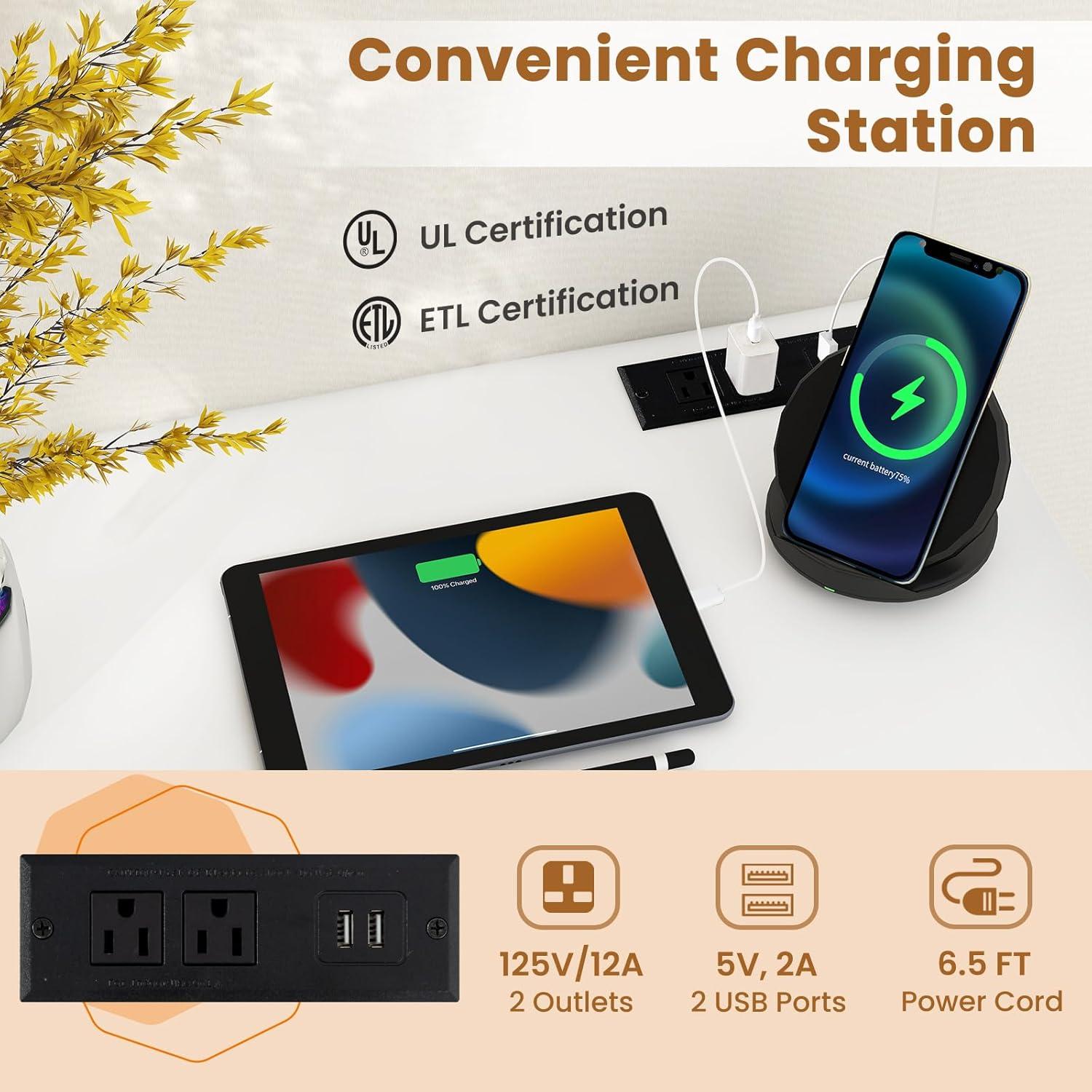 [Convenient Charging Station]: The computer desk integrates a recessed charging station to power up your devices. 2 outlets (125V/12A) and 2 USB ports (5V, 2A) keep your essential electronics fully charged and within reach.