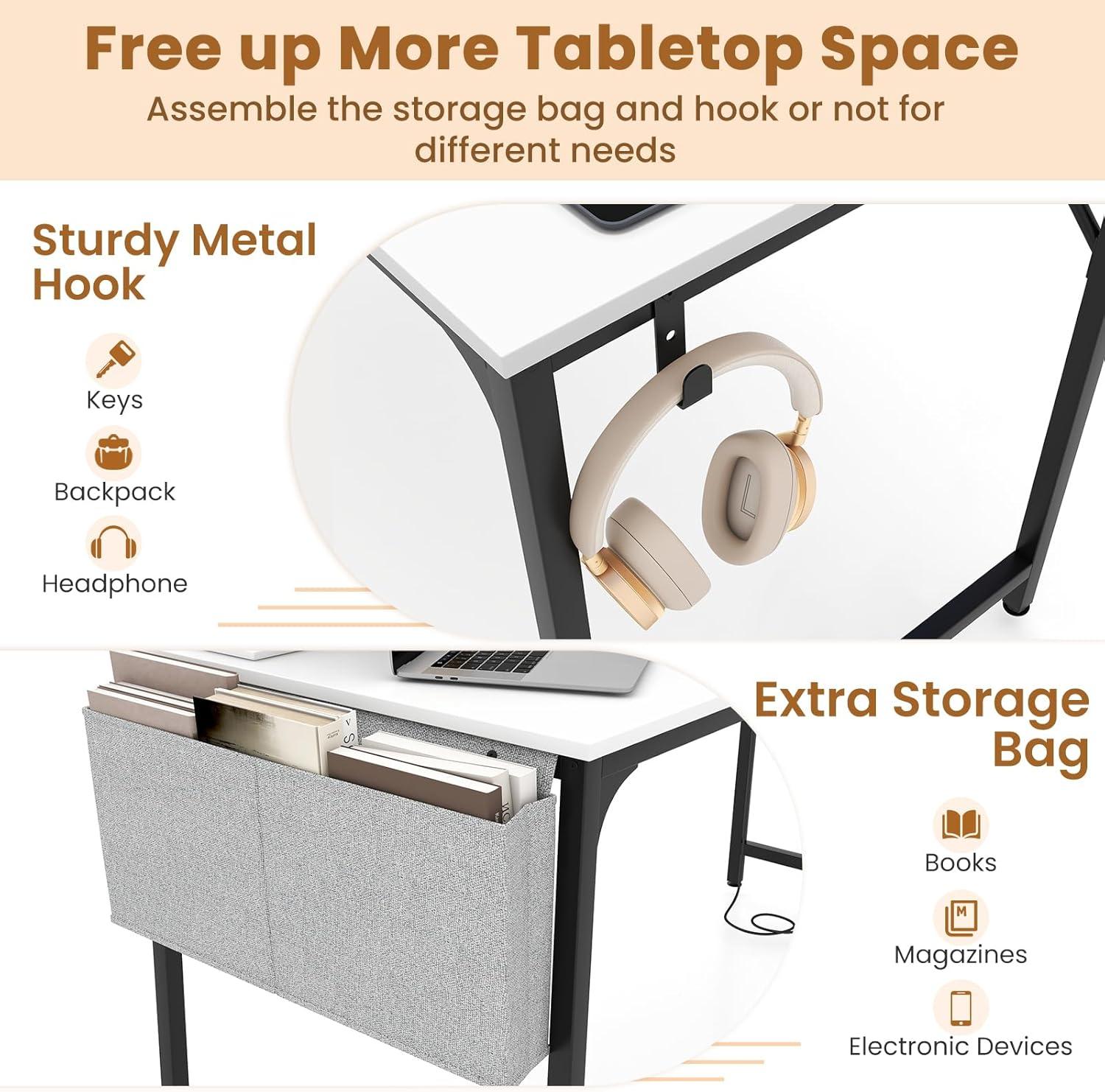 Upgrade your workspace with this computer desk! The built-in charging station eliminates the need for searching for outlets or dealing with messy cords. The ample desktop surface provides plenty of room for your computer, accessories, and documents. A bonus storage bag and headphone hook keep your essentials organized, thus to free up more tabletop space. Other than that, built on a sturdy metal frame, our computer workstation promises unparalleled stability and support. Marrying functionality with elegance, the sleek desk beautifies your home office while providing practicality.