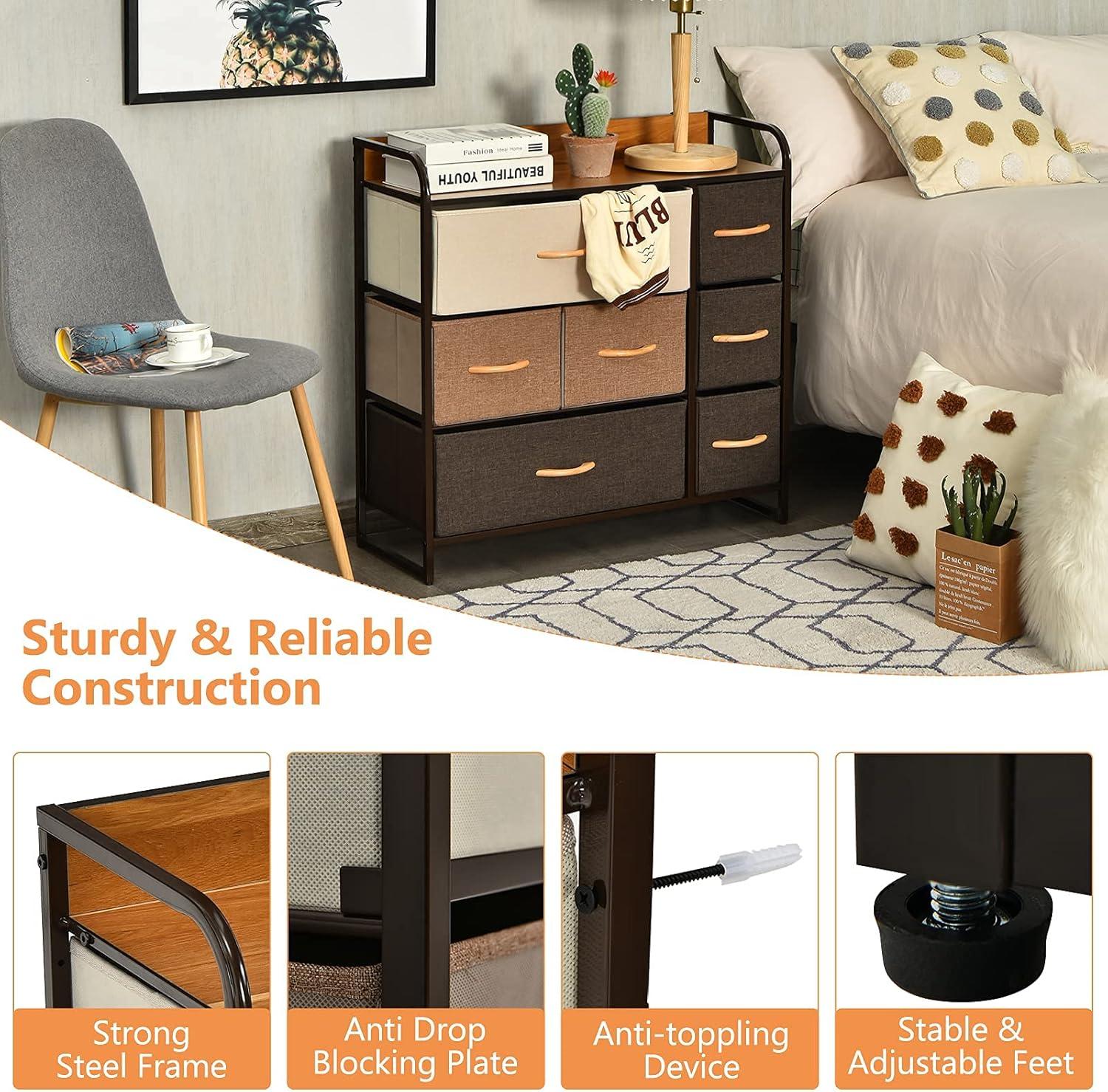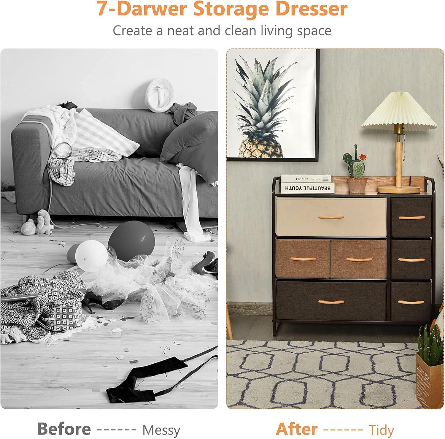 【Large Capacity & Premium Fabric】: Equipped with 7 foldable and removable drawers of 3 different sizes, this dresser provides large space for you to store items by type, including clothes, toys, scarves, socks, etc. to make your room neat. Moreover, the drawers are made of high quality fabric, which is breathable and durable.