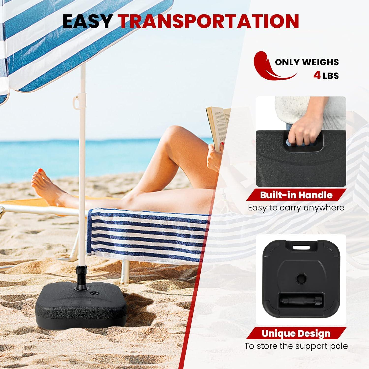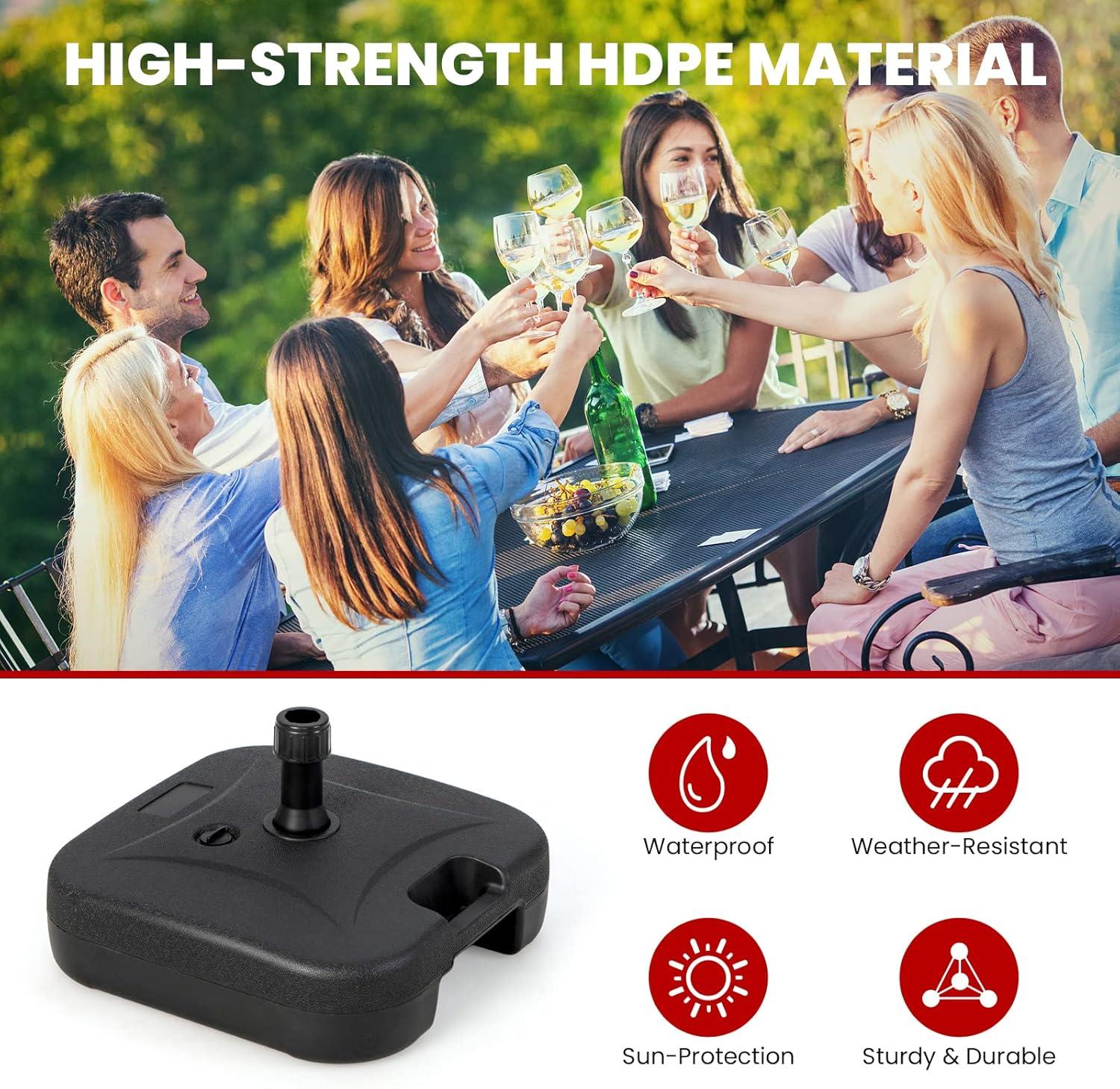 【Quick Installation】: This weighted market umbrella base is easy to set up and requires no tools. All you need to do is insert the support pole, fill the base with water or sand, then insert and tighten the umbrella pole.