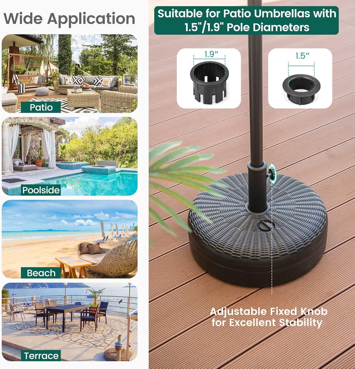 【Fits 1.5″-1.9″ Umbrella Poles】: The fillable umbrella base has 2 plastic adapters that fit for 9-10 ft umbrellas with 1.5″-1.9″ diameter poles. You can tighten the adjustment knob to ensure a tight and stable fit of your umbrella.