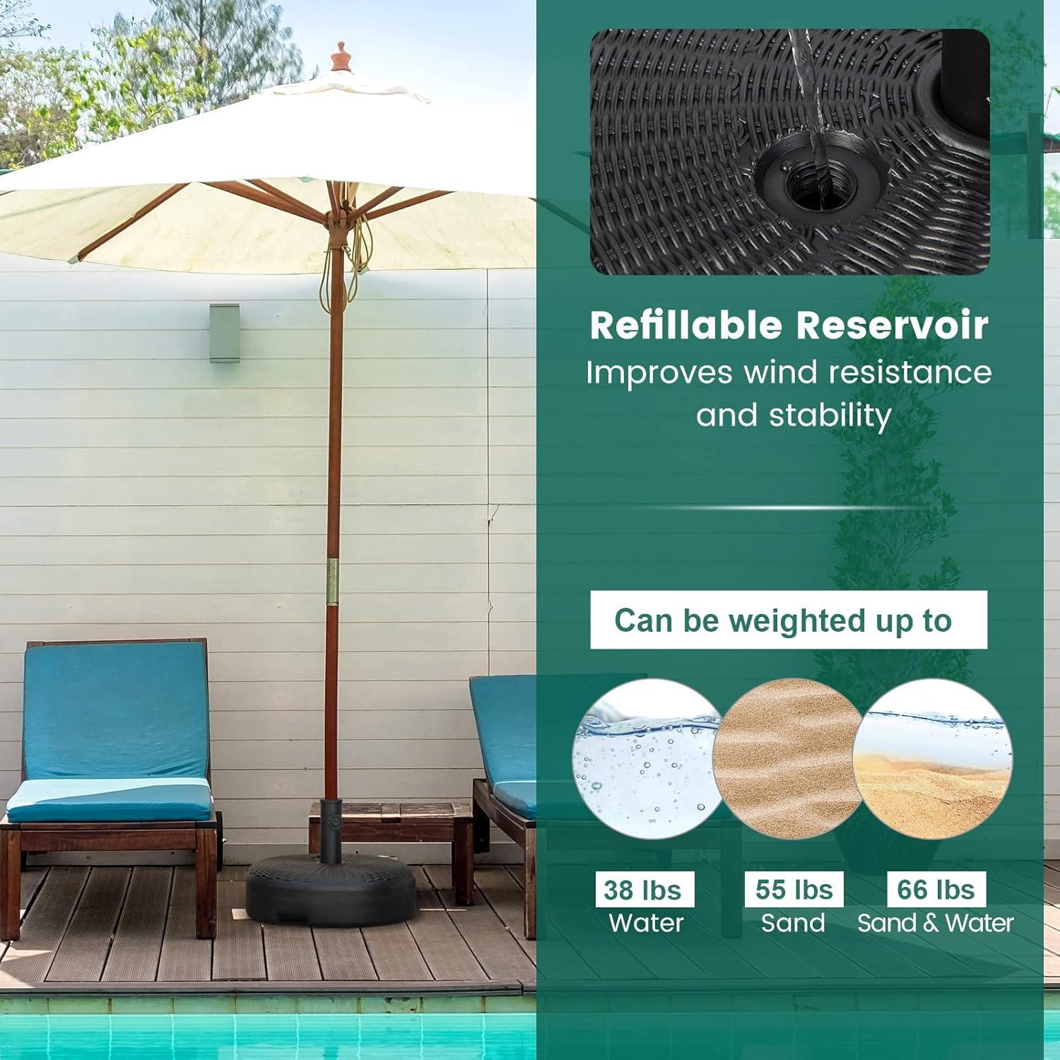 【Water or Sand Filled Umbrella Base】: This stable and sturdy umbrella weight base can be filled with water or sand. It weighs up to 45 lbs with water, 62 lbs with sand, 75 lbs with sand and water.