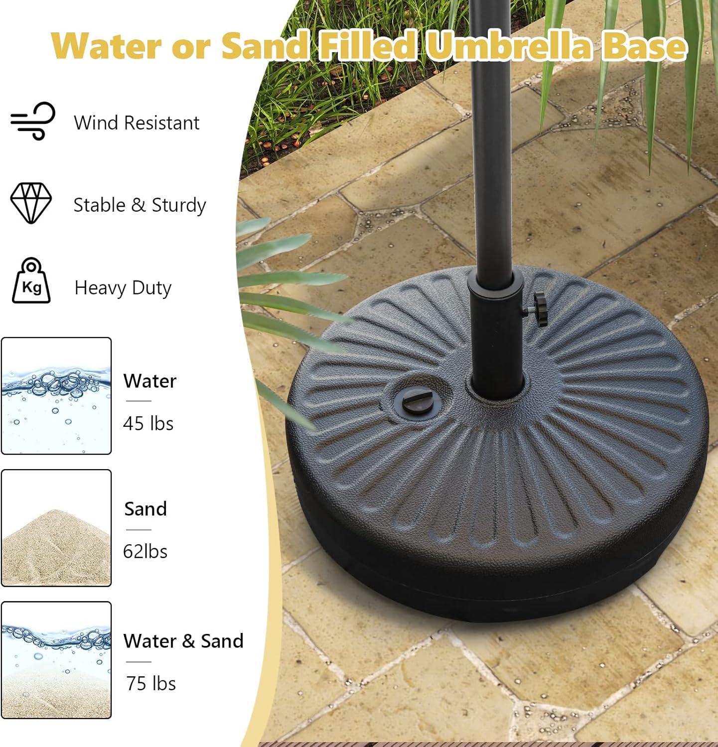 【Water or Sand Filled Umbrella Base】: This stable and sturdy umbrella weight base can be filled with water or sand. It weighs up to 45 lbs with water, 62 lbs with sand, 75 lbs with sand and water.