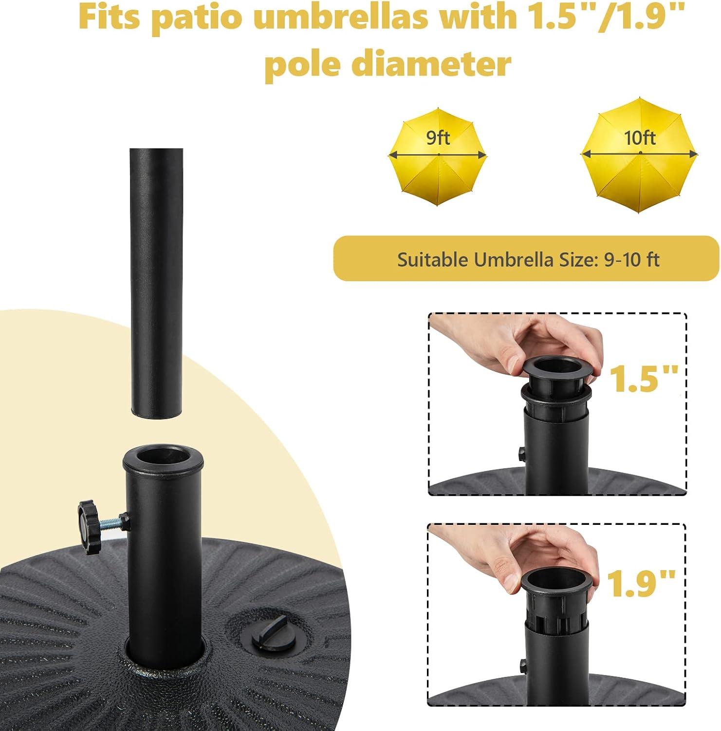 【Fits 1.5″-1.9″ Umbrella Poles】: The fillable umbrella base has 2 plastic adapters that fit for 9-10 ft umbrellas with 1.5″-1.9″ diameter poles. You can tighten the adjustment knob to ensure a tight and stable fit of your umbrella.