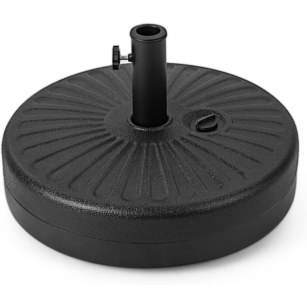 Our round umbrella base that easily fills with water or sand. Constructed of heavy duty metal and HDPE material, this patio umbrella base is highly durable to withstand a range of climates. It comes with 2 adapters on the top of the steel tube that fit 1.5″ to 1.9″ diameter umbrella poles. The knob is designed for convenient operation to tighten the pole to firmly secure your umbrella from 9-10 ft. It is decorative with an attractive appearance for outdoor use on patios, pools, gardens, decks, porches, etc.