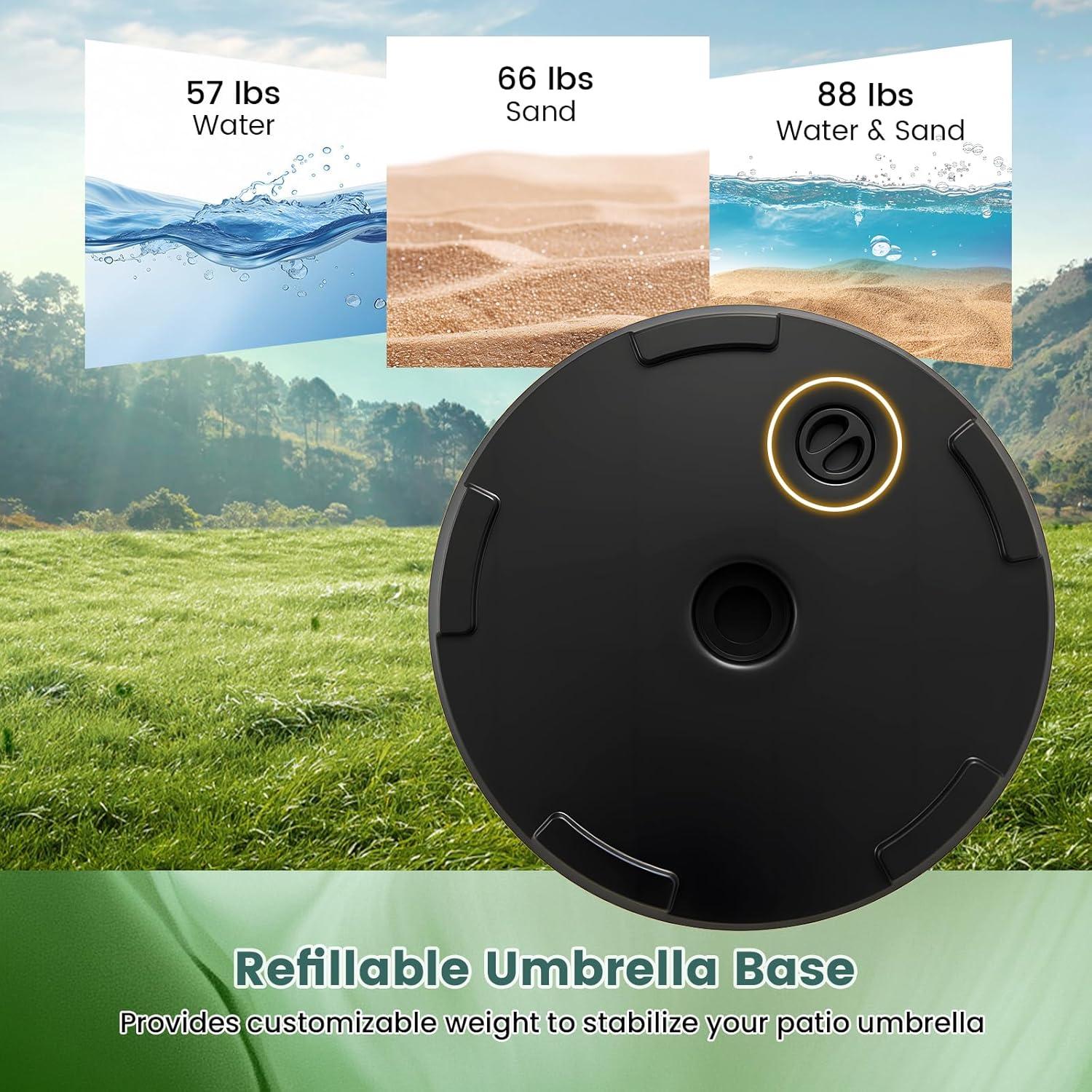 【Water or Sand Filled Umbrella Base】: This stable and sturdy umbrella weight base can be filled with water or sand. It weighs up to 45 lbs with water, 62 lbs with sand, 75 lbs with sand and water.