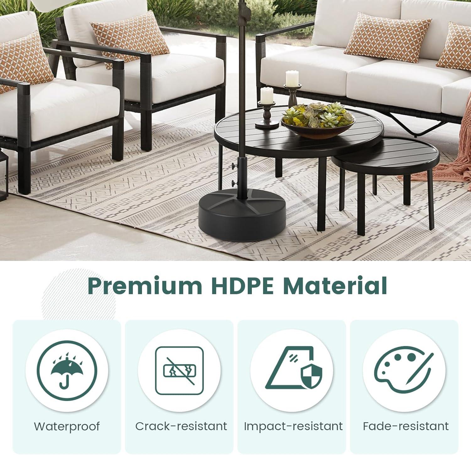 【High Quality Materials】: With waterproof HDPE base and heavy-duty metal tube, the patio umbrella stand is wear-resistant, sun-proof and wind-resistant to realize durable service life and ensure optimal strength and stability.