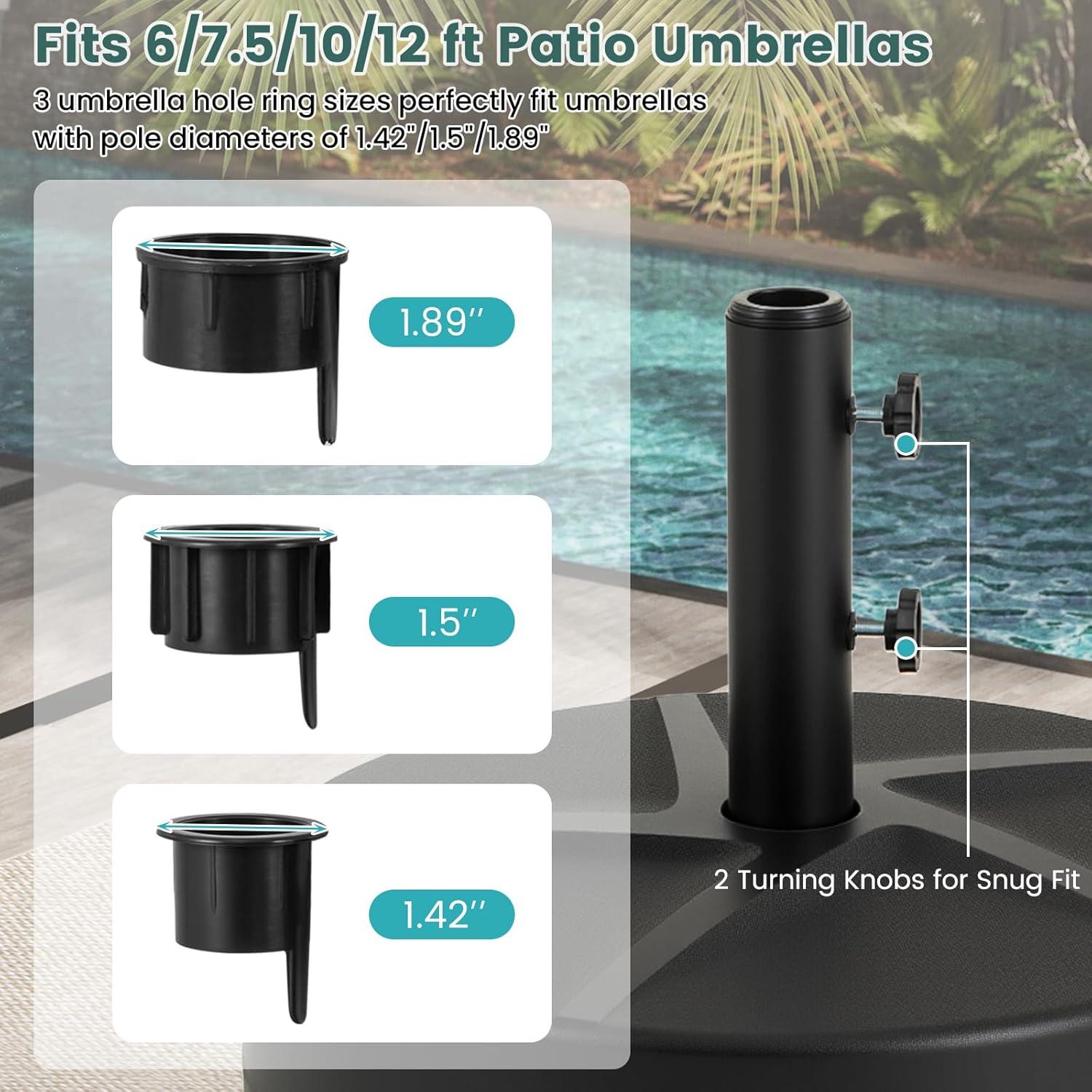 【Fits 1.5″-1.9″ Umbrella Poles】: The fillable umbrella base has 2 plastic adapters that fit for 9-10 ft umbrellas with 1.5″-1.9″ diameter poles. You can tighten the adjustment knob to ensure a tight and stable fit of your umbrella.