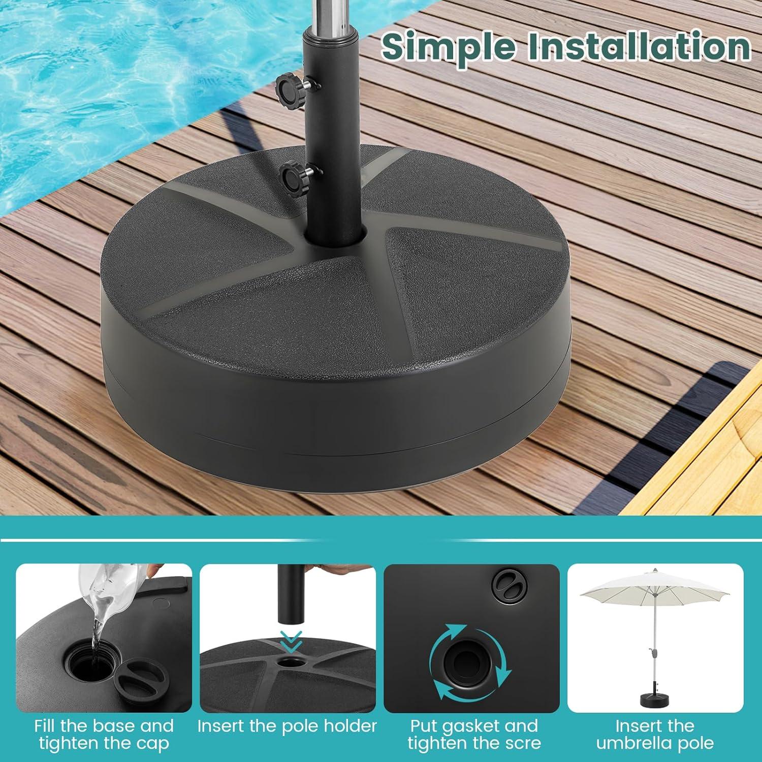 【Easy to Assemble】: The weighted umbrella base is easy to set up and only requires 4 steps. Install the support pole, fill the base with water or sand, choose the appropriate plastic adapter, and finally adjust the fixed knob for excellent stability.