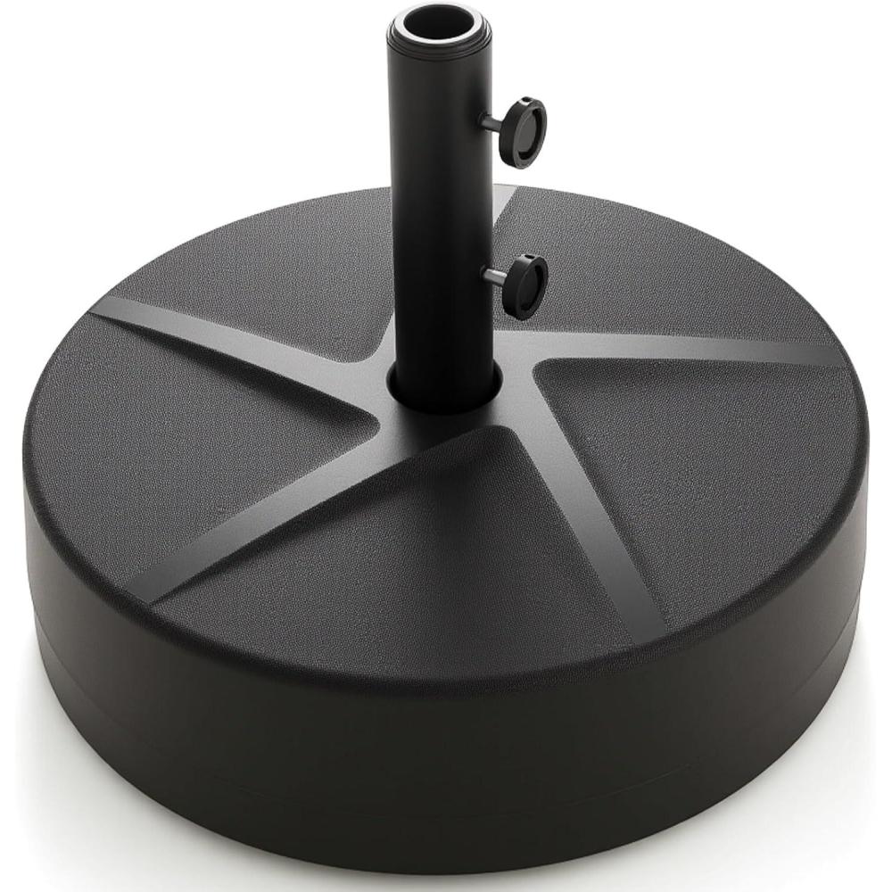 Our round umbrella base that easily fills with water or sand. Constructed of heavy duty metal and HDPE material, this patio umbrella base is highly durable to withstand a range of climates. It comes with 2 adapters on the top of the steel tube that fit 1.5″ to 1.9″ diameter umbrella poles. The knob is designed for convenient operation to tighten the pole to firmly secure your umbrella from 9-10 ft. It is decorative with an attractive appearance for outdoor use on patios, pools, gardens, decks, porches, etc.