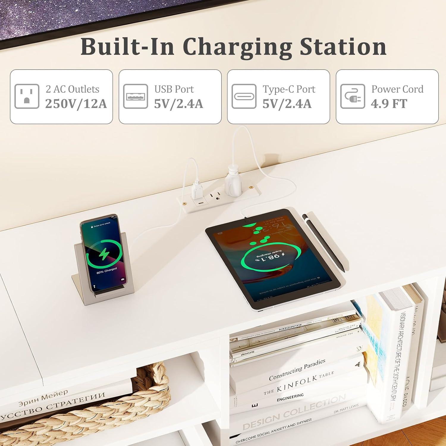 [Built-In Charging Station]: Stay connected without the mess. Our TV entertainment center includes a built-in charging station with 2 AC outlets (125V/12A), a USB port (5V/2.4A), and a Type-C port (5V/2.4A), offering a convenient charging hub for your devices right where you need them.