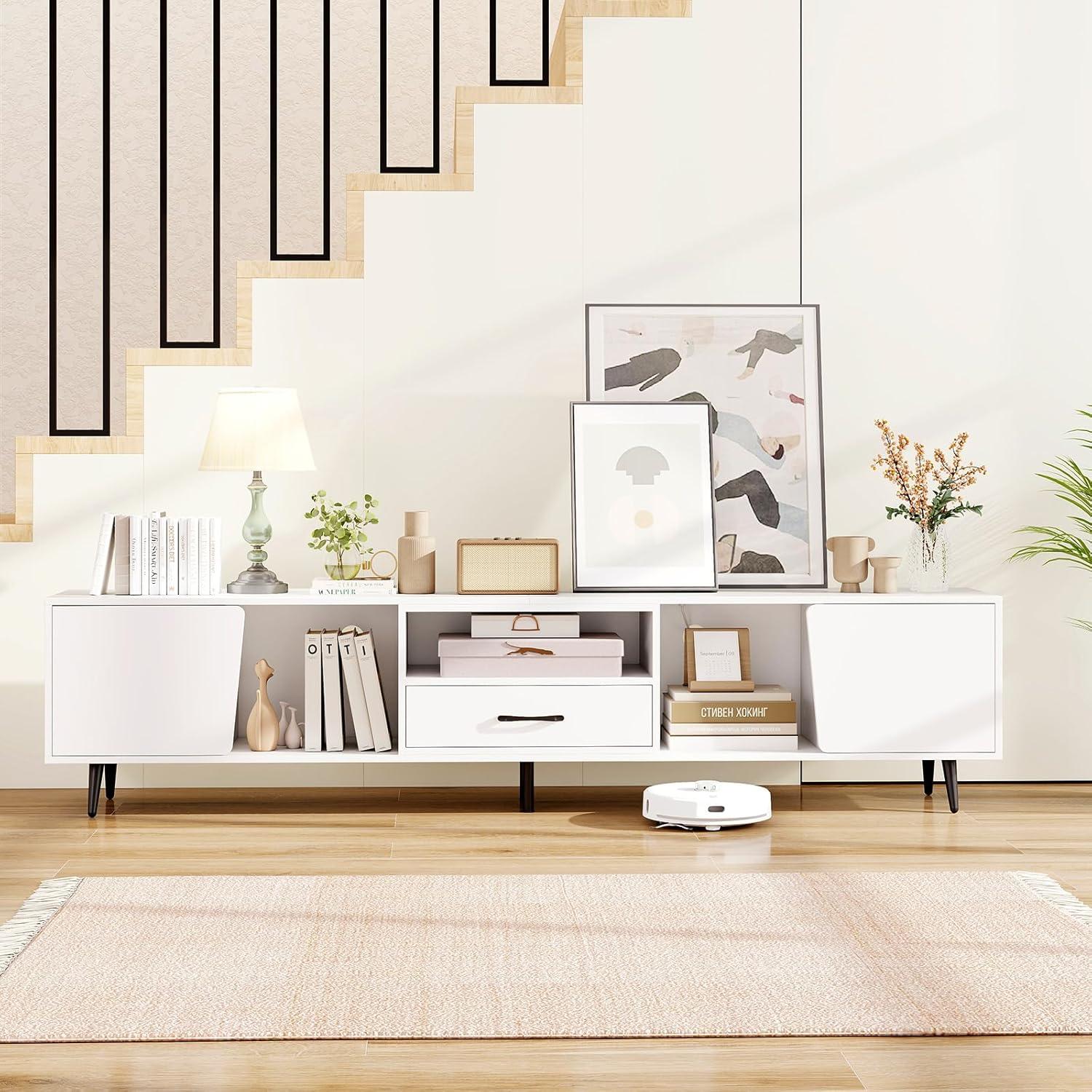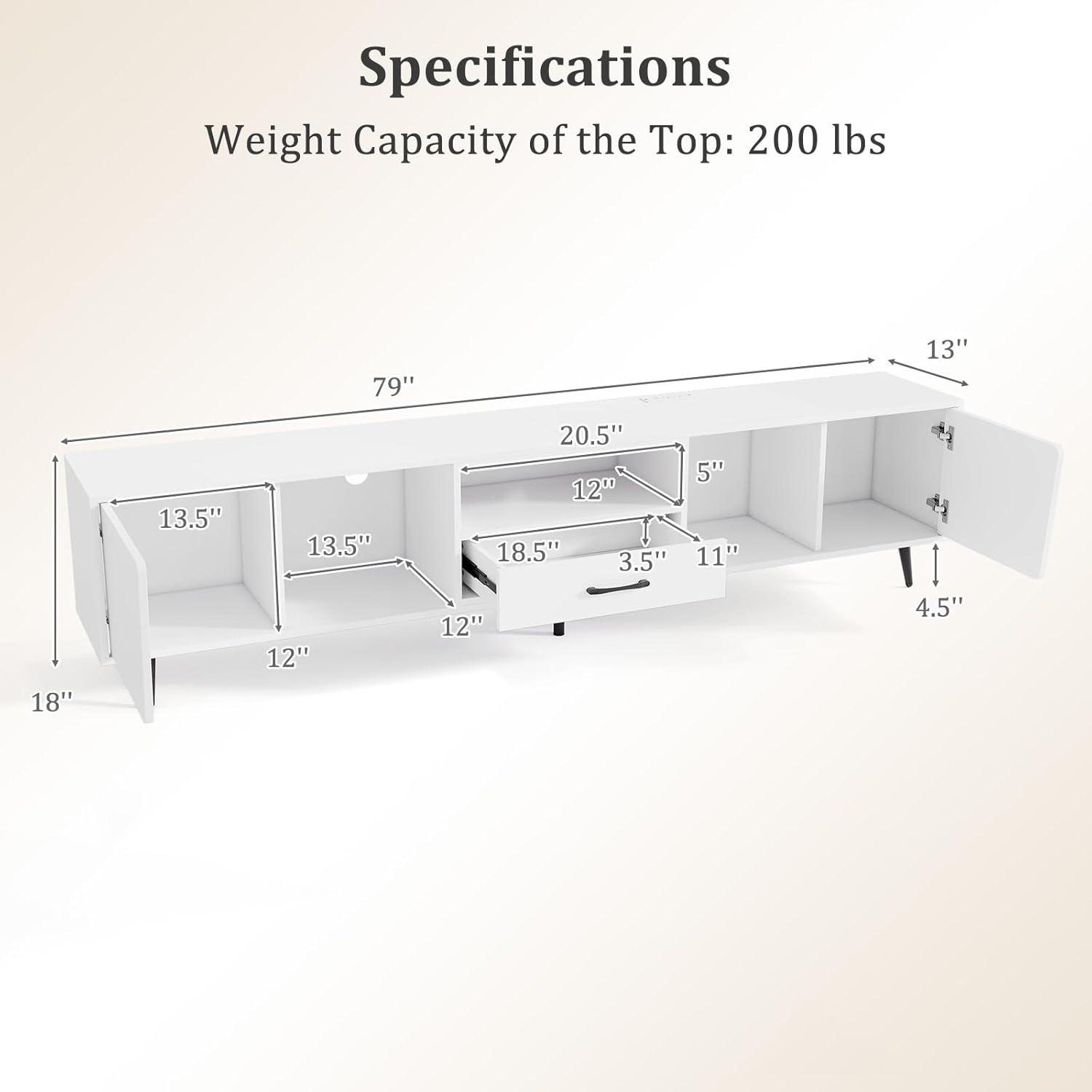 [Accommodate TVs up to 90″]: Equipped with a 79″ long tabletop, this white TV stand is perfectly suitable for TV size up to 90″, catering to most modern TVs while offering a comprehensive view for an exceptional viewing experience.