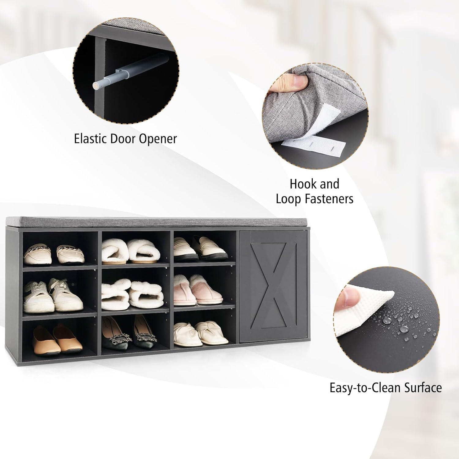 [ Cabinet with Elasticity Opening System ]: Our storage bench is also designed with a door cabinet, allowing you to hide various stuff behind the door. The closet with elasticity opening system is super easy to open. What you need to do is to push the door inside, then the door will open automatically.