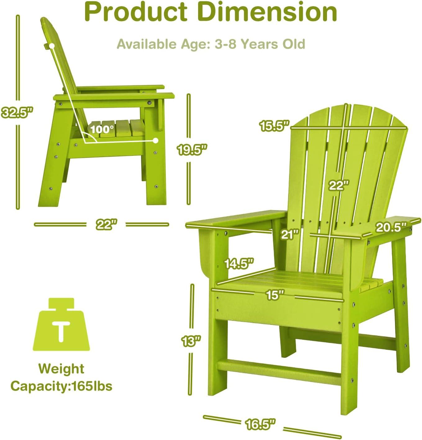[100-degree elevation ergonomic angle for maximum comfort]To offer the ultimate ideal of comfort, the HDPE Adirondack chairs are designed with a slanted high backrests to fit child's body curve and sitting postures. Plus, the wide armrests and footrest give optimal support for their hands and feet.This outdoor chair features a seat with a 100-degree elevation, which allows kids to sit deeper and relax their body to the greatest extent.
