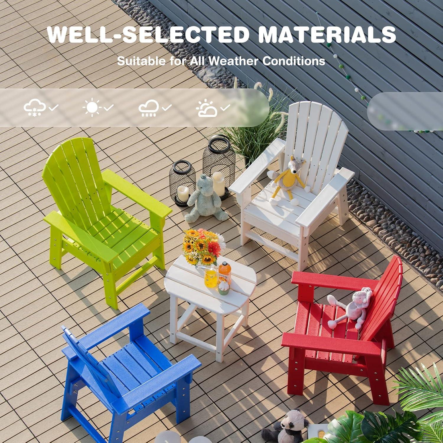 [First priority to quality – well-selected HDPE material & 304 stainless steel screws]This child Adirondack chair is made of premium high density polyethylene material, which is resistant to any harsh weather conditions, and won't even fade, warp, shatter, crack or peel for prolonged outdoor use.And the well-selected 304 stainless steel screws deliver excellent anti-rust performance to make all connections stronger.