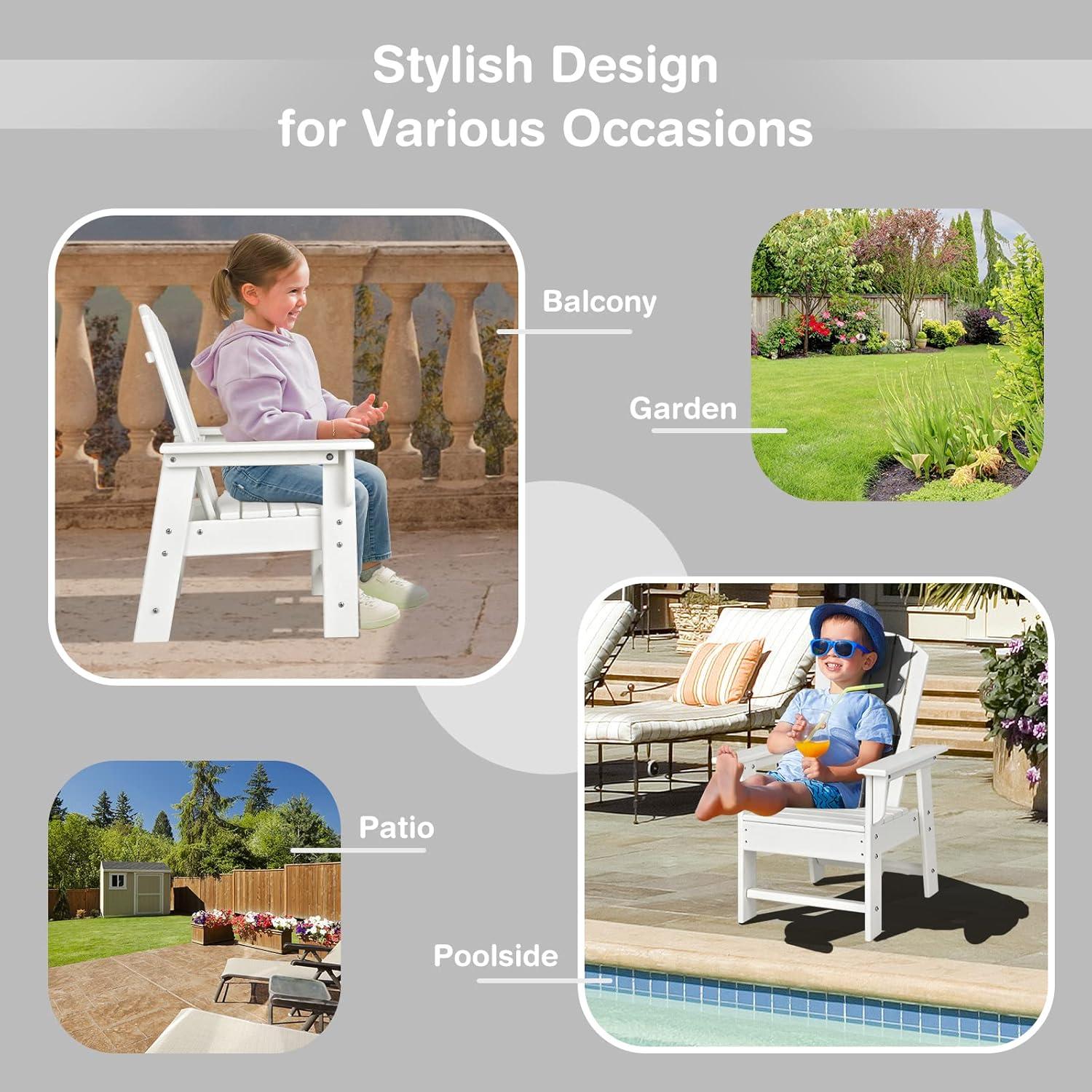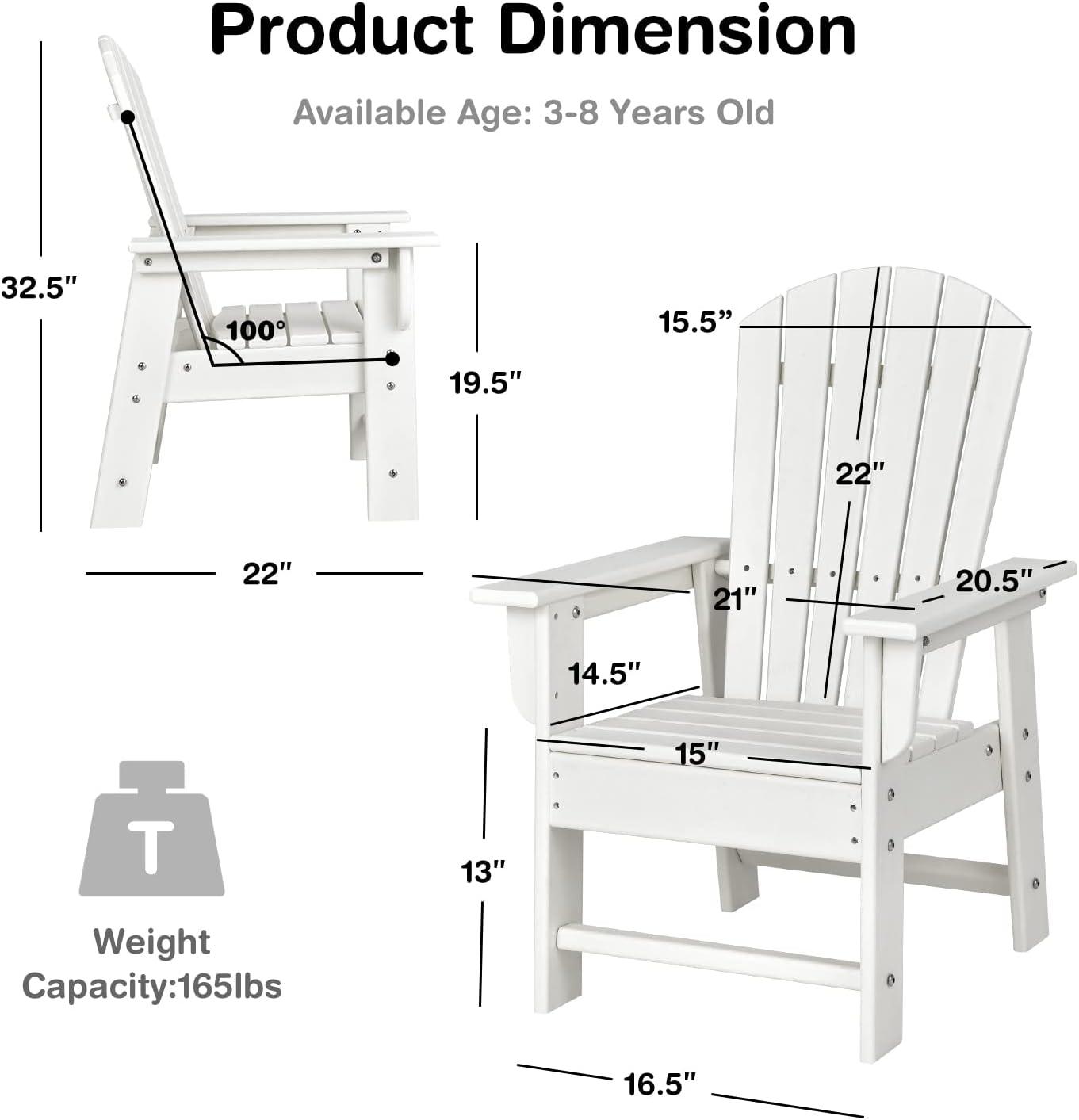 [100-degree elevation ergonomic angle for maximum comfort]To offer the ultimate ideal of comfort, the HDPE Adirondack chairs are designed with a slanted high backrests to fit child's body curve and sitting postures. Plus, the wide armrests and footrest give optimal support for their hands and feet.This outdoor chair features a seat with a 100-degree elevation, which allows kids to sit deeper and relax their body to the greatest extent.