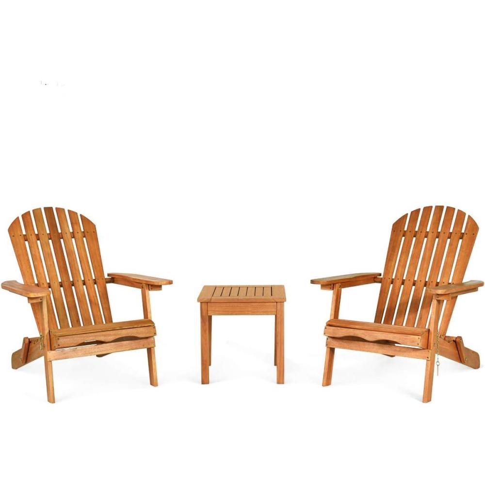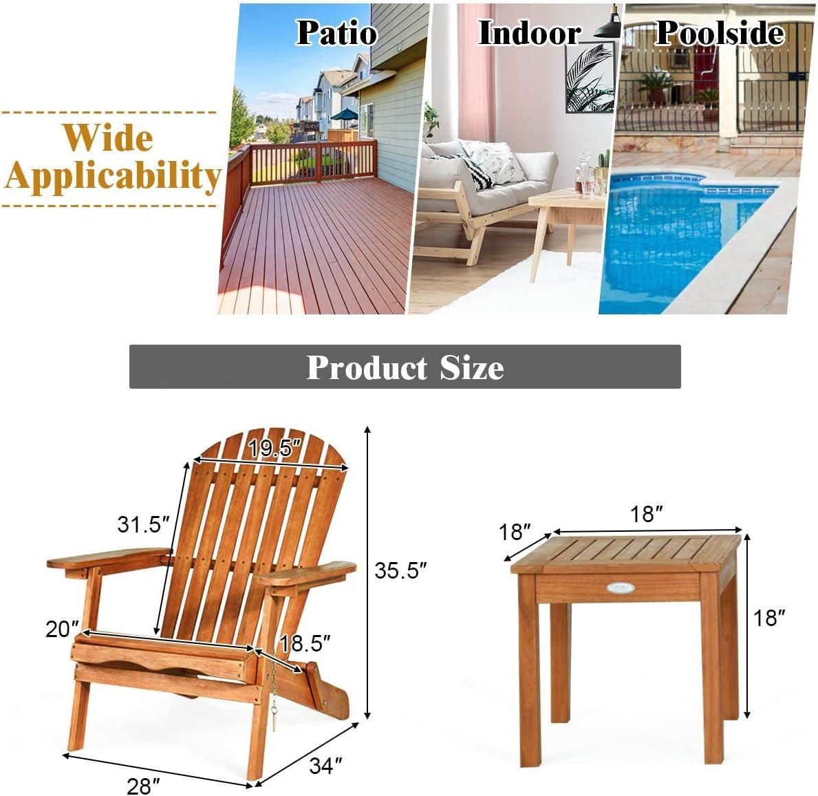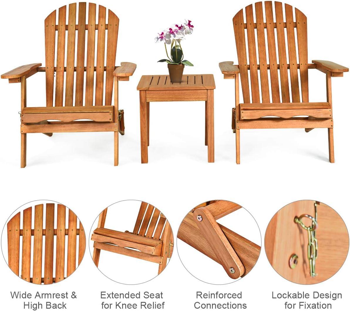 Giantex Adirondack Chair Set 3-Piece Foldable Wooden Chairs Set W/Widened Armrest, Eucalyptus Frame and Side Table Outdoor & Indoor Table Set for Patio Poolside Garden, Set of 3 Wooden Lounger Chair