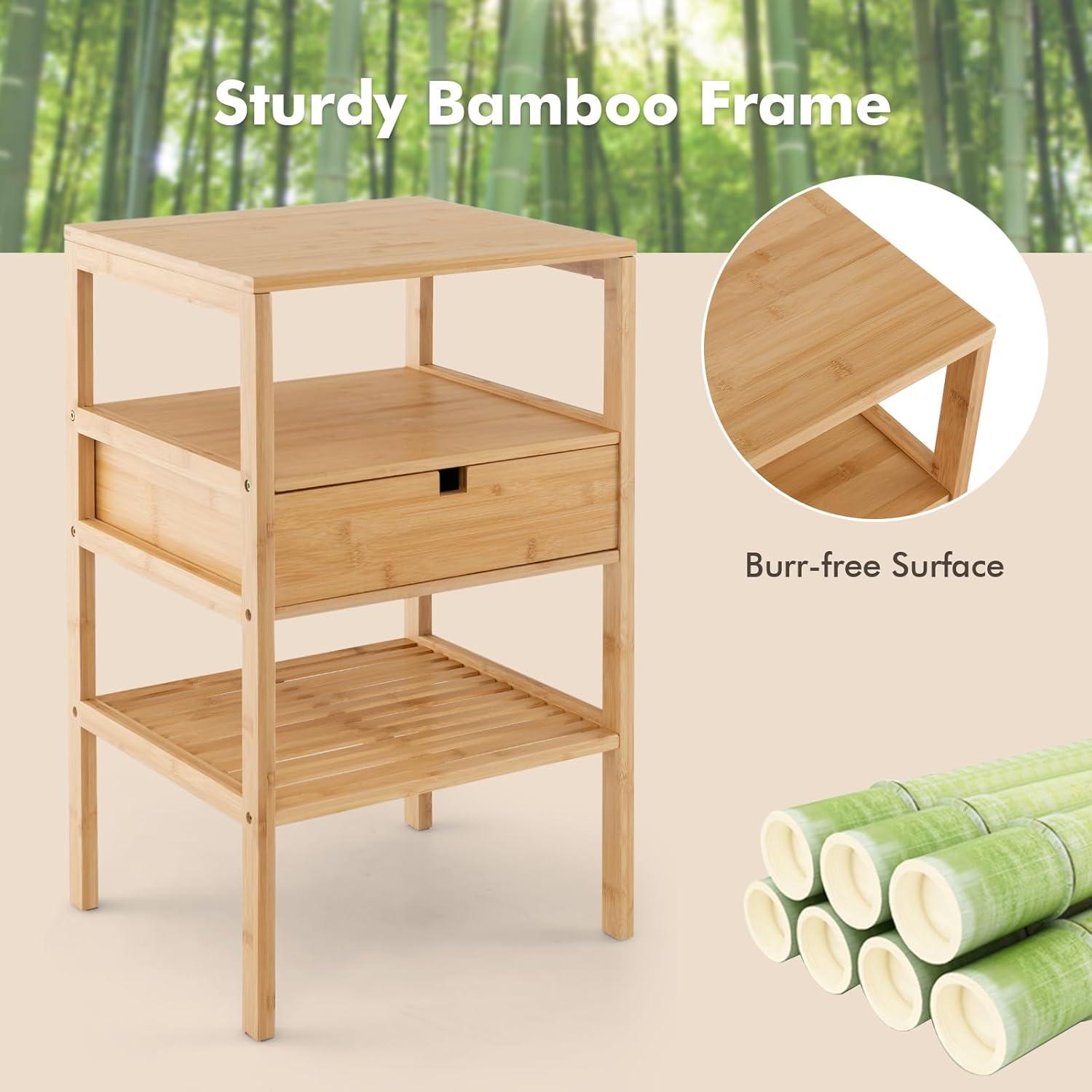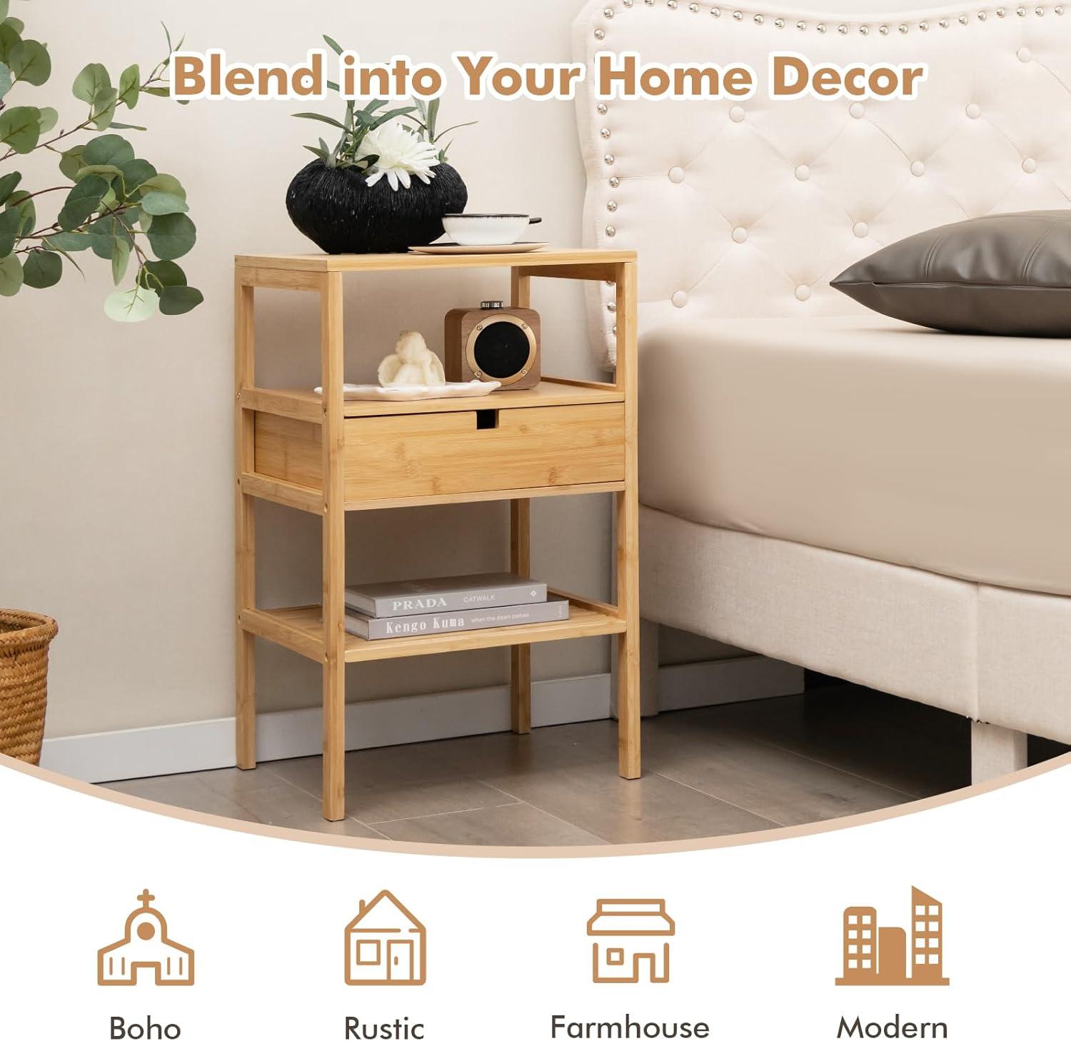 Giantex Bamboo Nightstands Set of 2, Wood Side Tables with Drawer and 2 Storage Shelves, Multifunctional Bedside Tables for Small Spaces, MCM Boho Style End Tables for Bedroom Office, Natural(Set of 1)