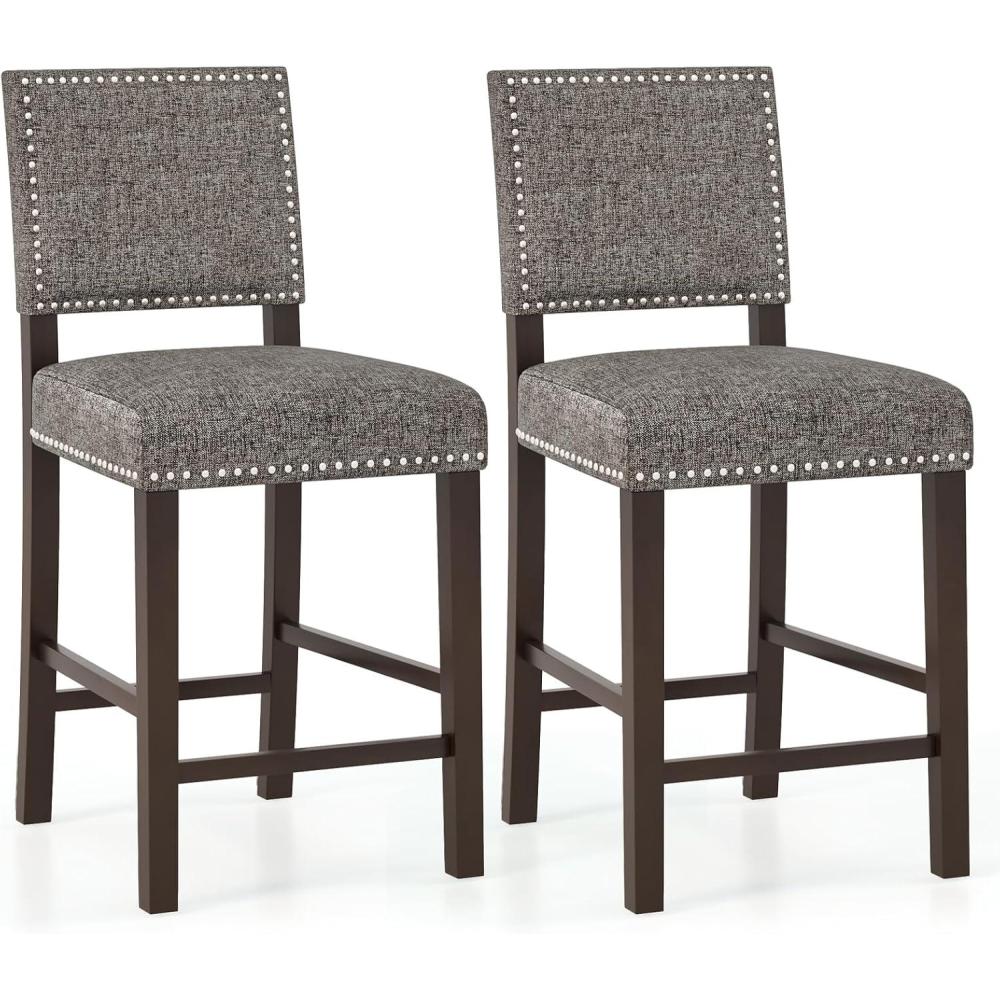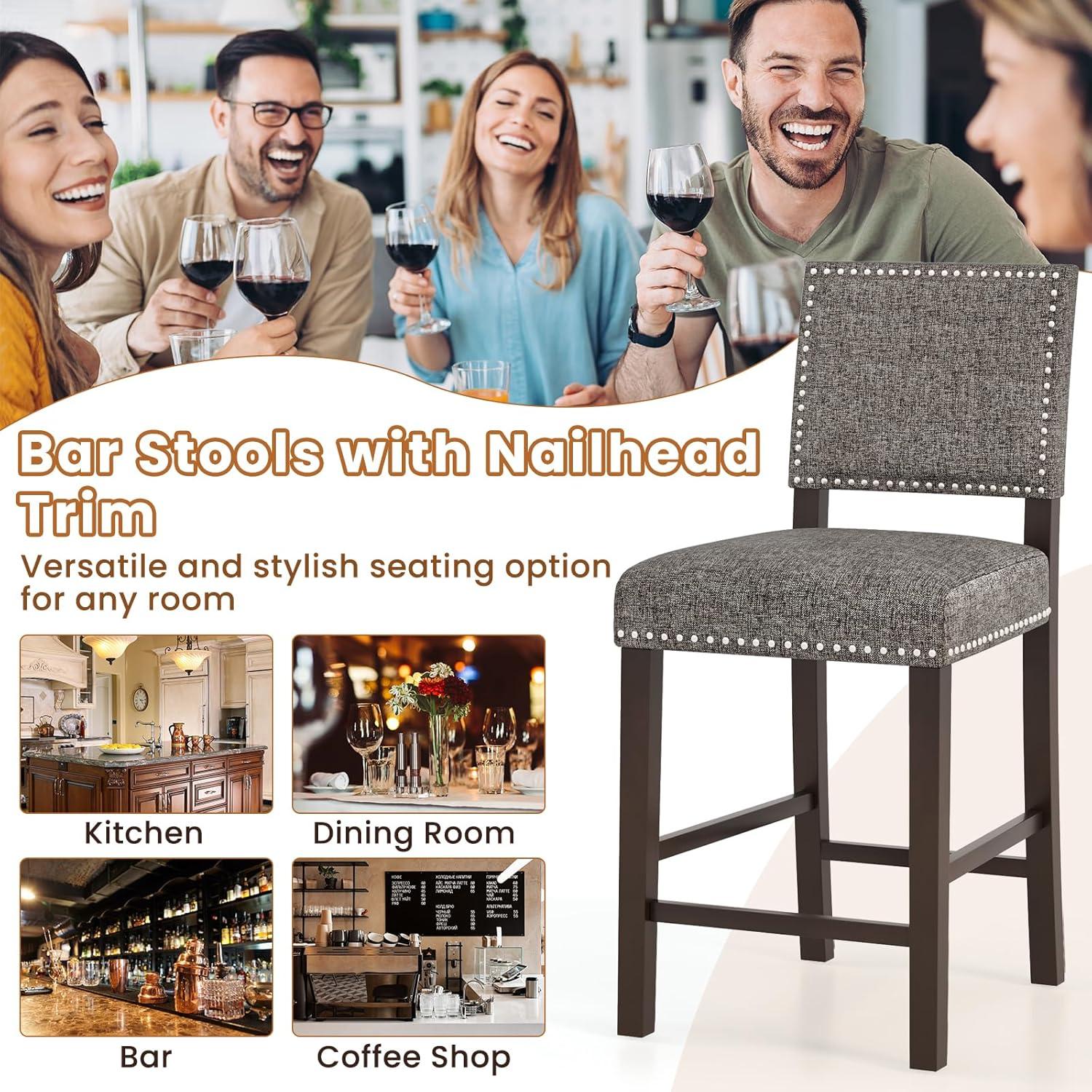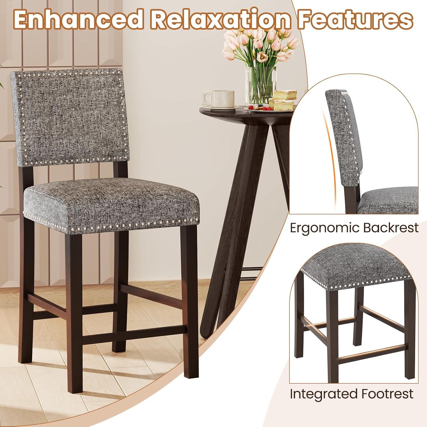 Wide & thick seat is filled with soft sponge and covered with durable linen fabric, which add much comfort to your leisure time. More, the combination of cozy backrest and footrest allows you to sit back and relax while enjoying your meals or drinks. For reliable structure, sturdy rubber wood legs provide superior stability, supporting a weight capacity suitable for long-lasting use. Its modern style with antique rivet design blends seamlessly with various interior aesthetics, providing a timeless and versatile seating option. Whether used in the dining room, kitchen, or restaurant, the well-designed bar stool set will undoubtedly be an ideal choice.