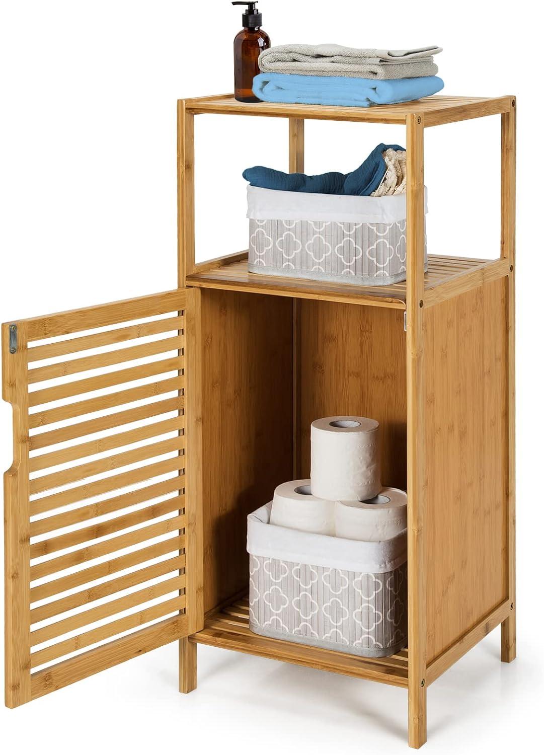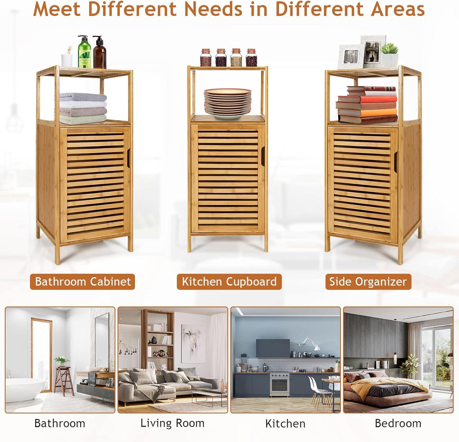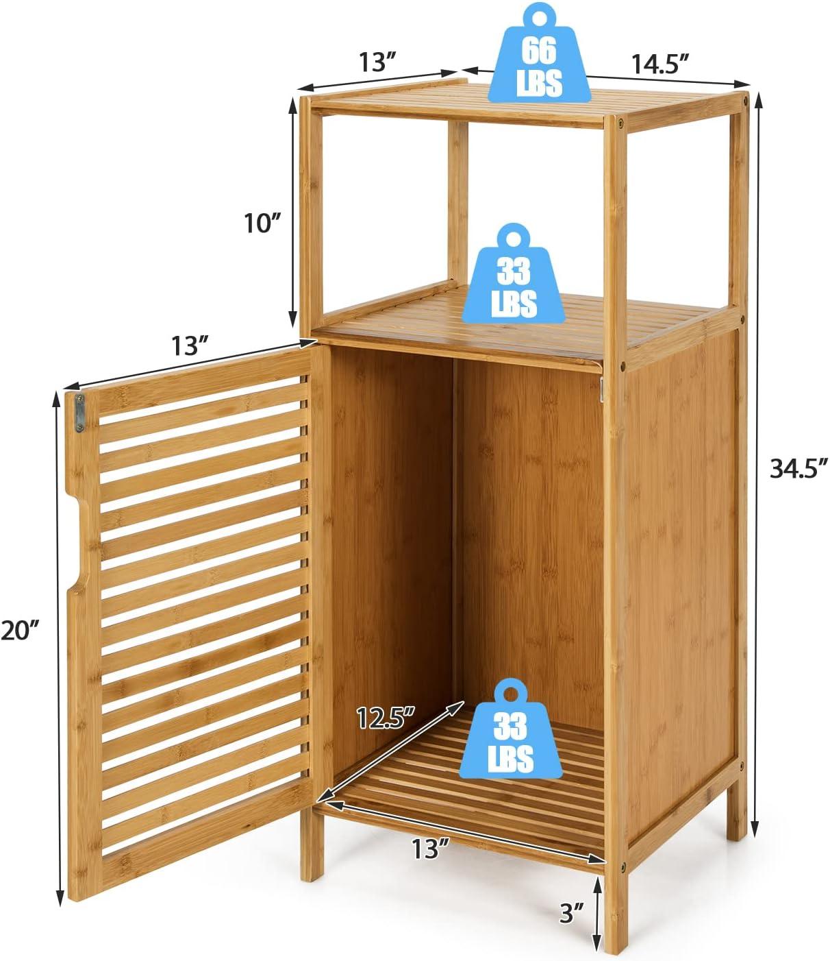 The combination of 2 shelves and 1 storage cabinet with door offers ample storage space for your daily items. You can use it as a bathroom cabinet, a kitchen cupboard or a side organizer. Besides, natural bamboo material makes it non-toxic and odorless. Solid frame and 4 bamboo legs keep it stable and sturdy. The top can support up to 66 lbs, while the cabinet and shelf can hold up to 33 lbs. Moreover, thanks to its slender shape, our storage organizer won’t take up too much floor space. It comes with detailed instruction and hardware for assembly. Groove handle and magnetic can also make it easy to use. In addition, designed with painted surface, it’s easy to maintain.