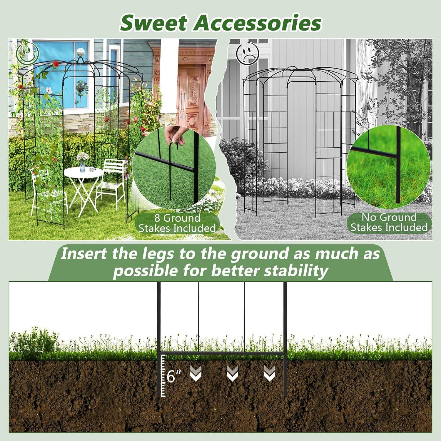 【Easy Installation】: Overall Dimensions: 9.4ft High x 6.8ft Wide. The French style garden arch is designed for effortless assembly and can be inserted into the soil up to a depth of 6 inches. It includes 8 ground stakes for additional stability.