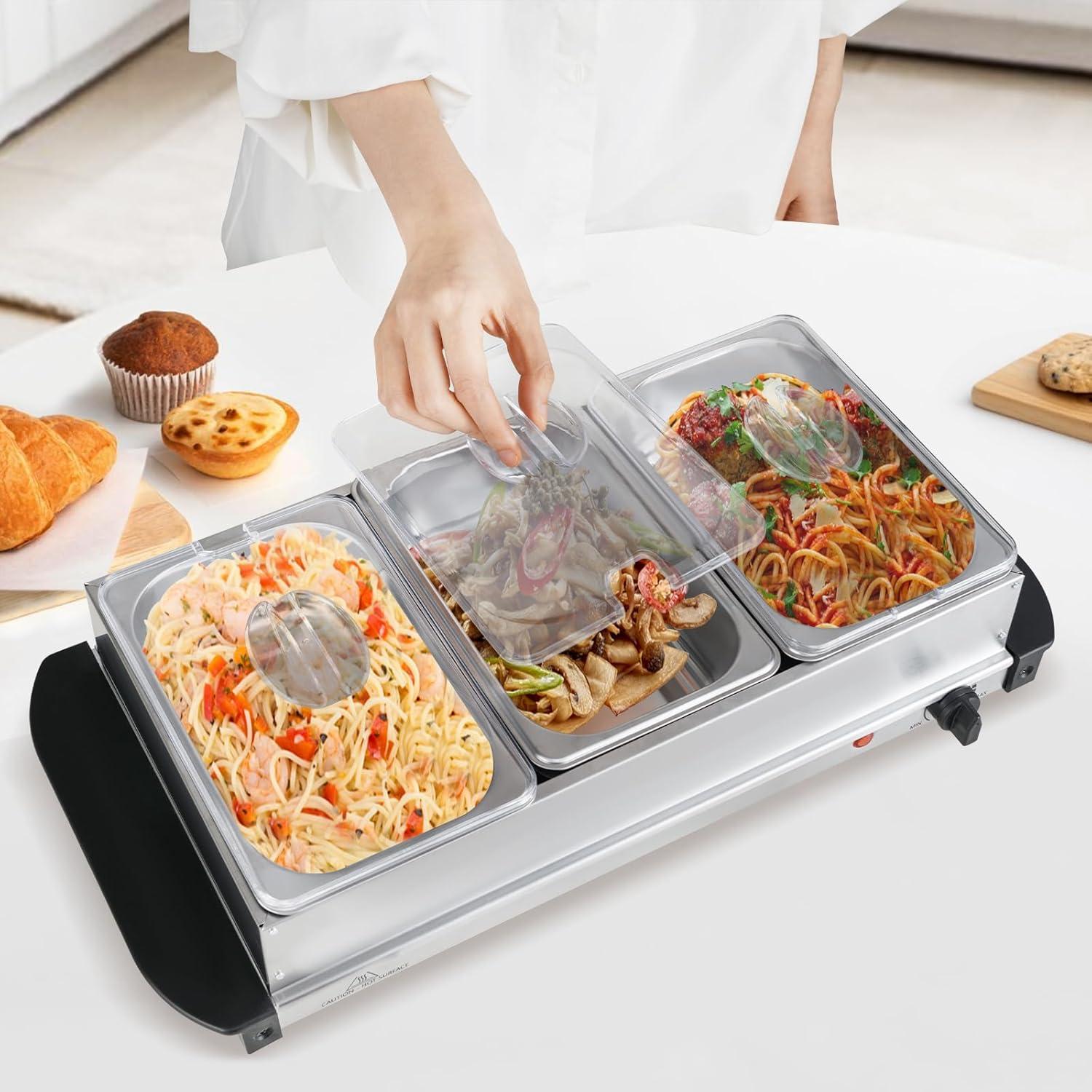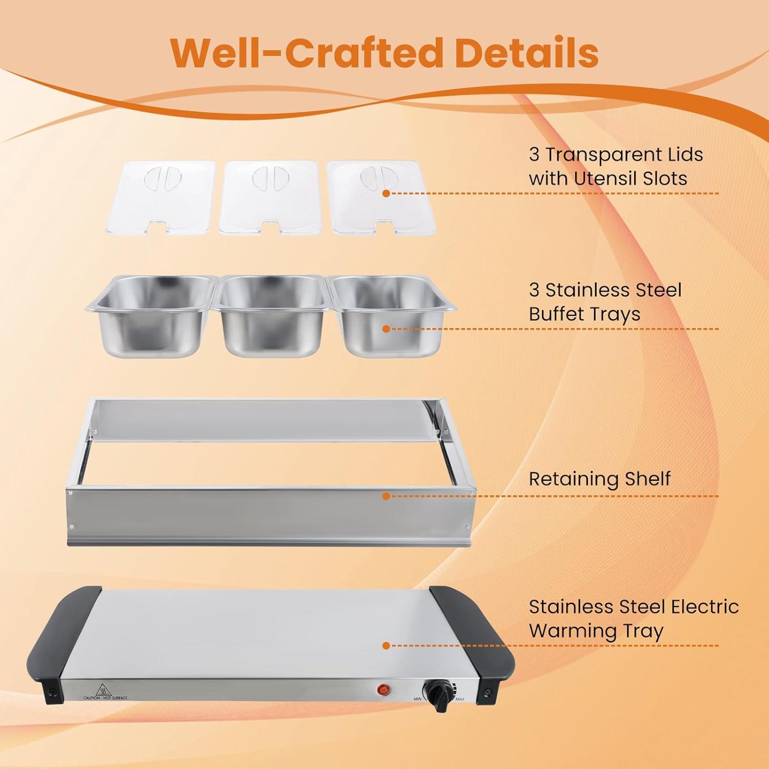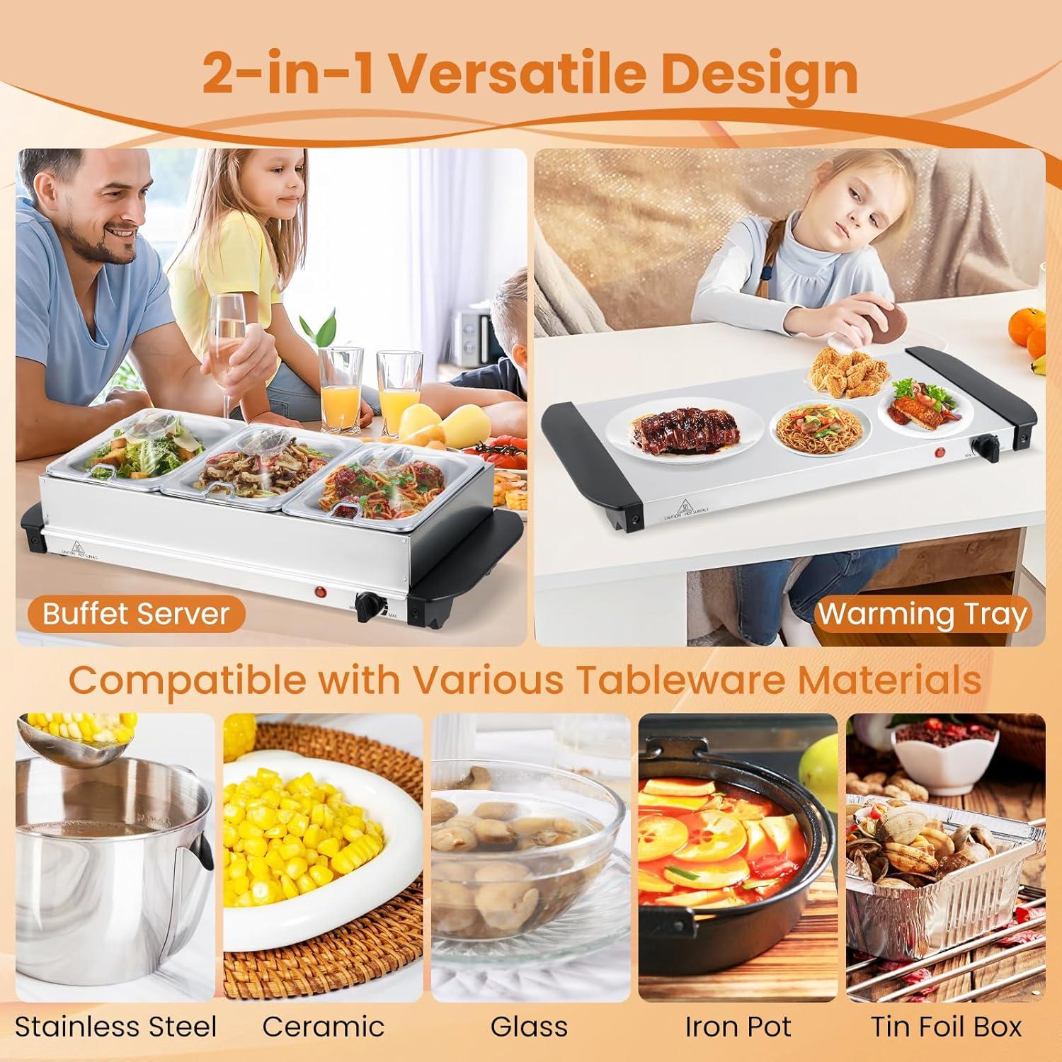 【2-in-1 Multipurpose Design】: Our electric food warmer serves as both a buffet server and a warming tray. Simply remove the water pan and 3 food pans included and place your own cookware, like glass, enamel, ceramic, aluminum, stainless steel, or others.