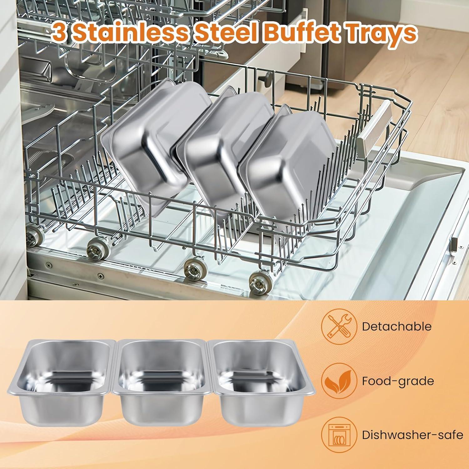【8 QT Capacity with 3 Food Trays】: With a total capacity of 8 QT, our buffet server comes with 3 stainless steel food trays. These trays are easily removable and dishwasher safe, making cleaning a breeze.