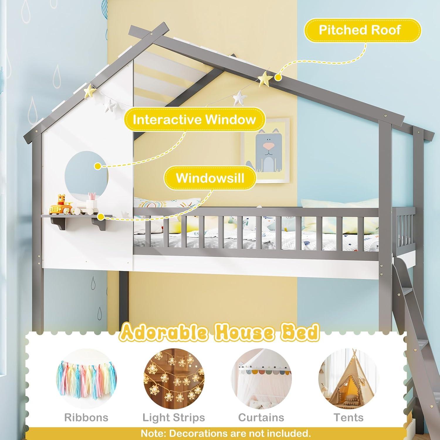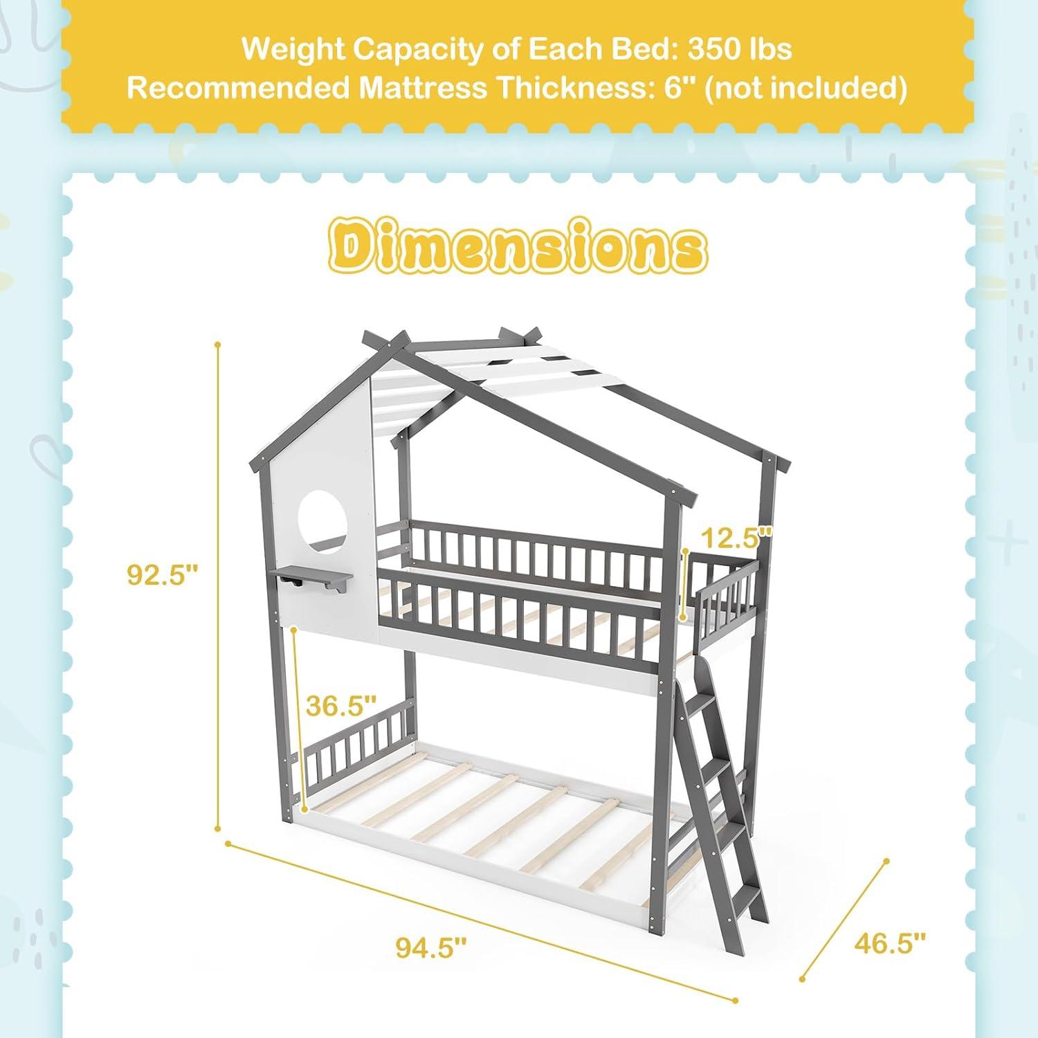 The unique house-shaped design not only sparks joy and imagination but also transforms any bedroom into a playful sanctuary. The house bed is constructed from solid wood for durability and stability. Besides, the sturdy plywood slats provide reliable mattress support, eliminating the need for a box spring. Moreover, the low-to-ground profile is ideal for younger children, making it easier for them to get into bed. The full-length guardrails and built-in ladder provide easy and secure access to the top bunk. All in all, the twin over twin bunk bed adds a whimsical touch while maximizing room space.
