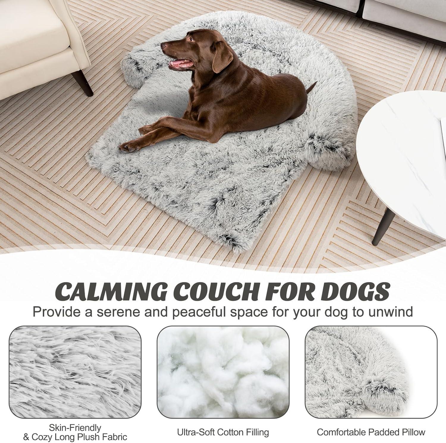 【Soft & Cozy Touch】: The dog couch features a plush and skin-friendly fabric, ensuring a comfortable and peaceful resting space for your furry friend. It is crafted with ultra-soft cotton filling and a cozy long plush fabric, offering a soothing touch. Additionally, it includes a padded pillow for extra support and comfort for your dog's neck and head.