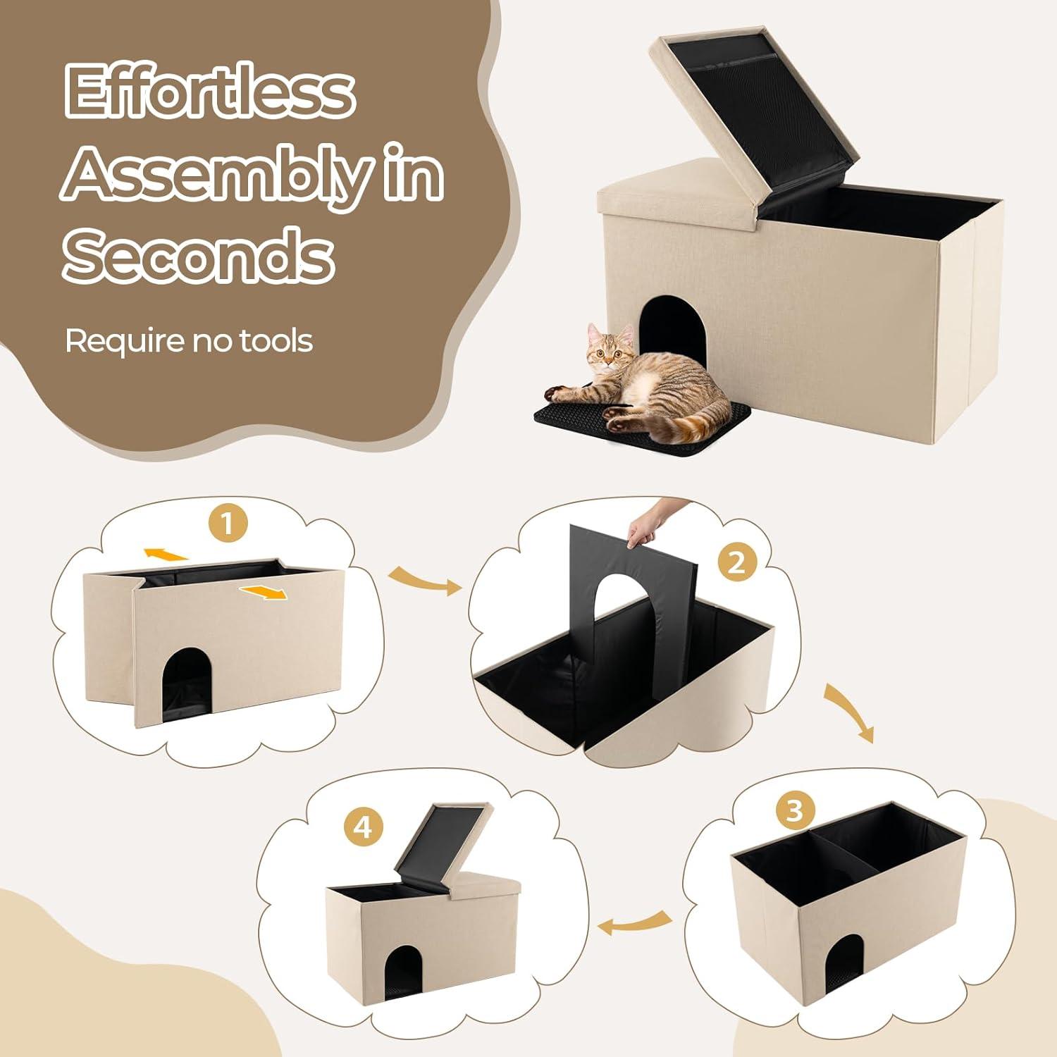 Our foldable cat litter box enclosure is multifunctional and measures 35.5'' x 20'' x 20'' (L x W x H). It can also be used as an ottoman, shoe bench, or foot rest. It provides a private space for your furry friend while preventing litter scattering and unpleasant smells. The flip top lid and cat litter mat make cleaning a breeze, and the odor control carbon filter neutralizes odors. The hidden litter box furniture consists of linen fabric, high-density sponge, MDF board, and a waterproof inner layer, ensuring both durability and comfort. Installation is quick and easy, taking just a few seconds.