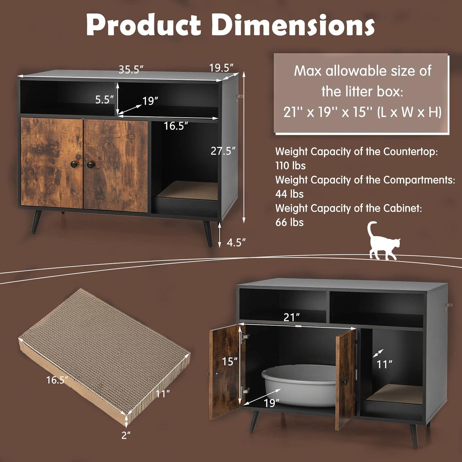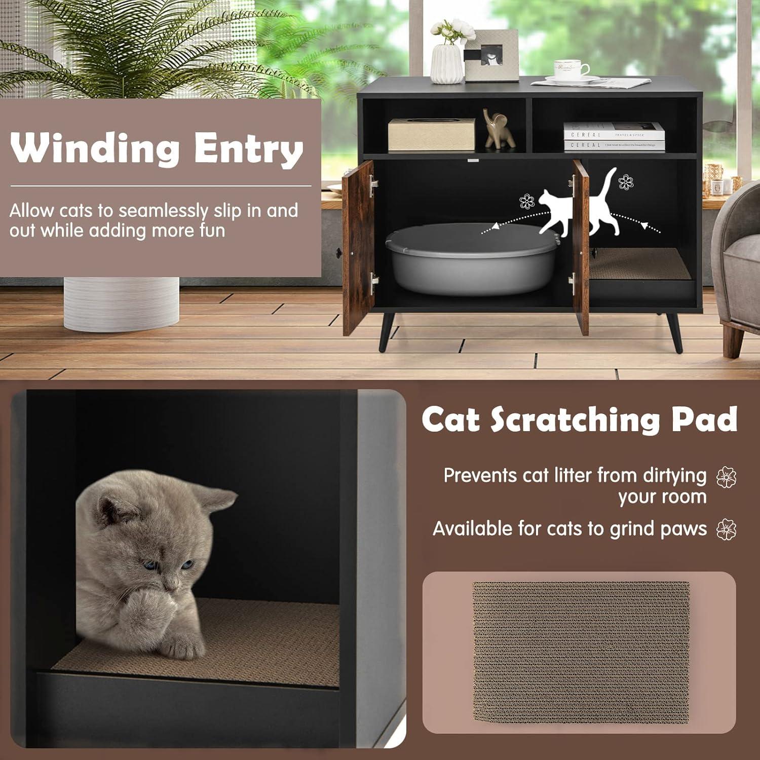 The cat house is designed with a large countertop, 2 open compartments and a double door cabinet to hold cat supplies, litter box, cat bed and more, keeping items well organized. We offer a cat scratching pad and a winding entry for more fun for your furry friend. This hidden cat washroom is perfect for cats to find a sense of security and belongings in the enclosed environment. And it can also be used as a cat house, storage cabinet, end table, bedside table or coffee table to suit your various needs.