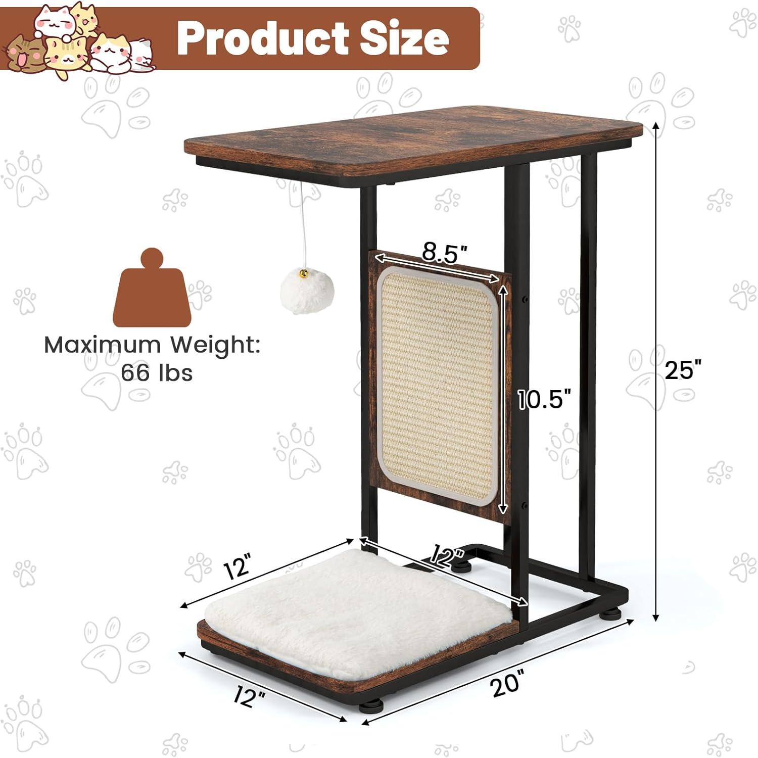 Giantex Cat Scratcher Side Table, C-Shaped End Table with Cat Scratching Board, Washable Cushion, Jingling Ball, Metal Frame, Couch Table Cat Tree Tower for Living Room Bedroom, Rustic Brown
